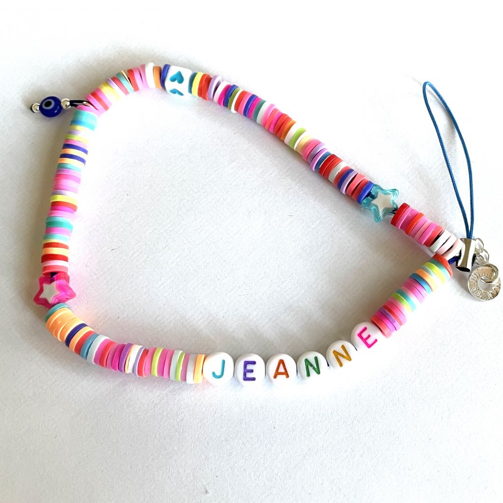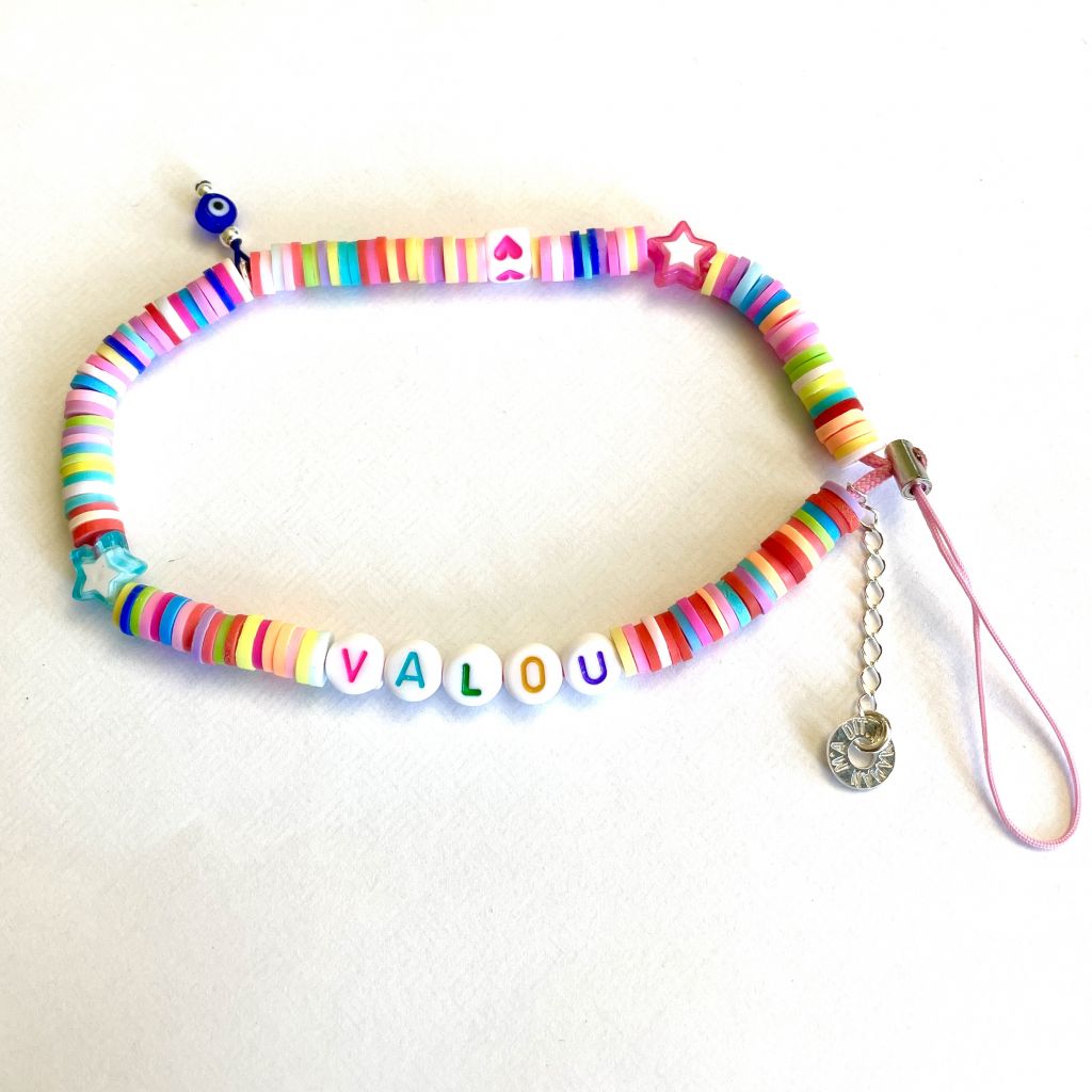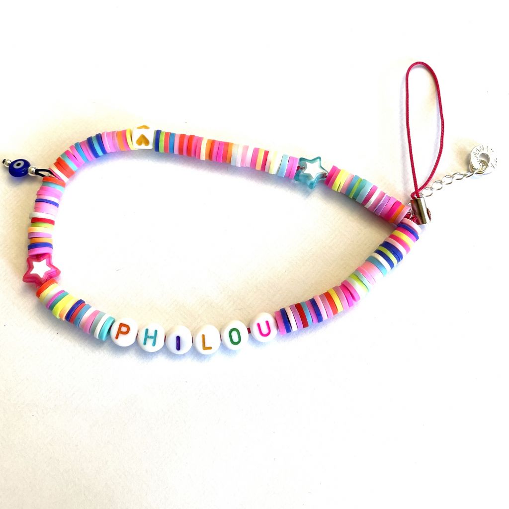 Sangle de téléphone en perles heishi, mot ou prénom au choix, œil porte bonheur. Photo non contractuelle, chaque pièce est unique. N'hésitez pas à m'indiquer dans les commentaires la couleur que vous souhaitez pour votre œil porte bonheur