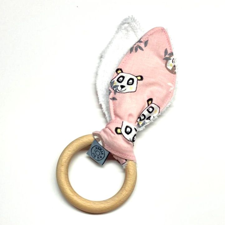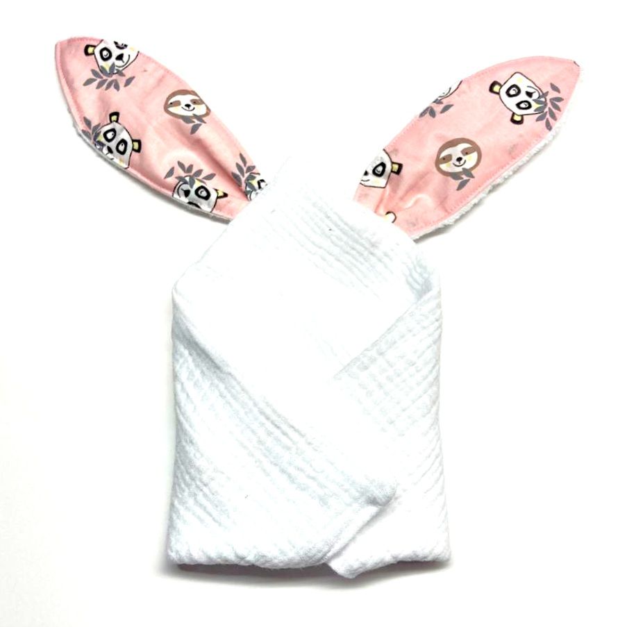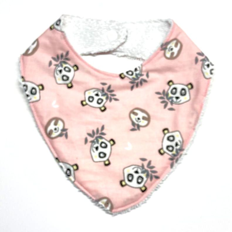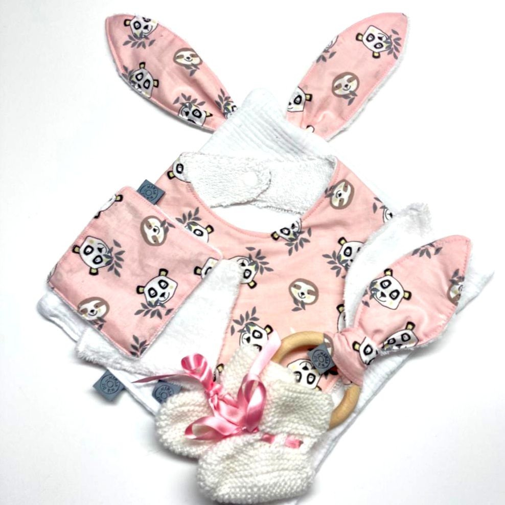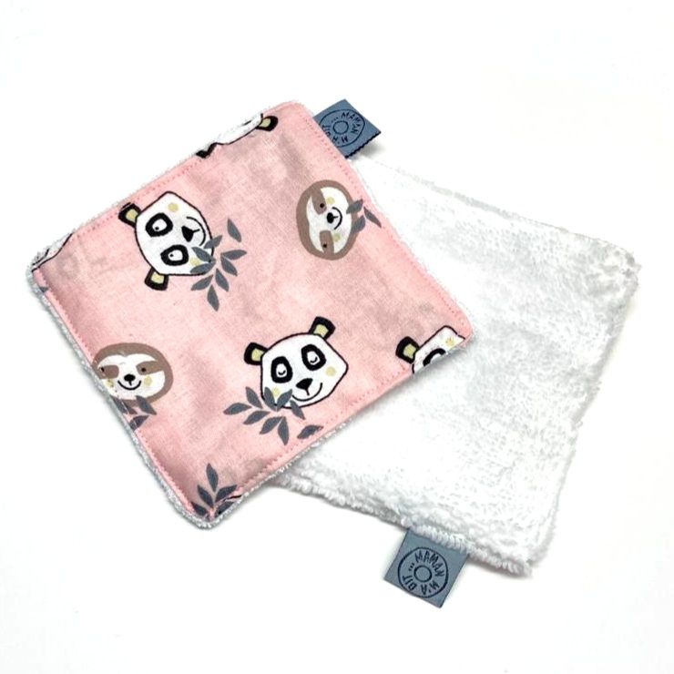 2 lingettes pandas roses et éponge bambou (40% coton 40% viscose 20% polyester) 10 x 10 cm, lavable en machine à 40°.
