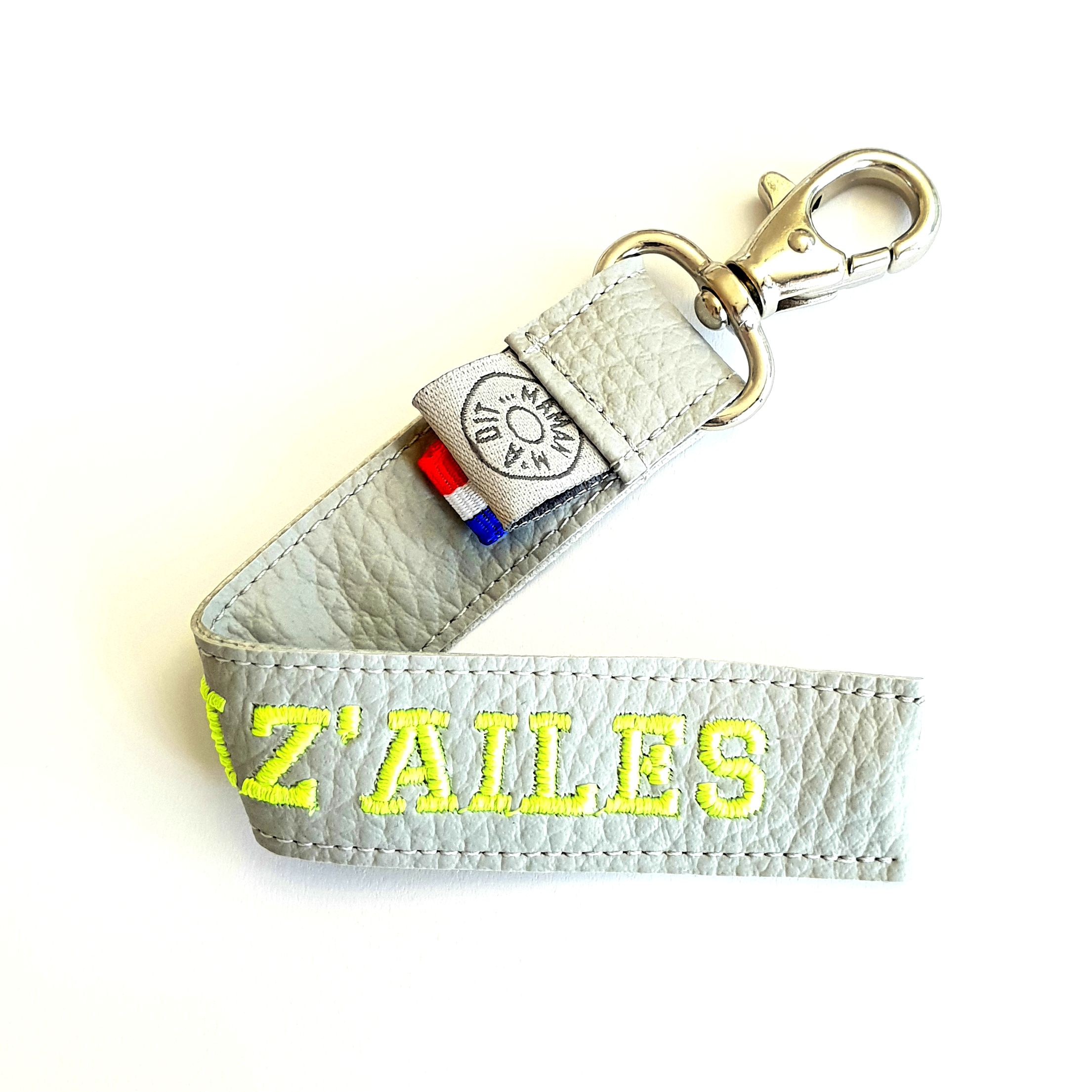 Broderie au choix possibilité d'ajouter un petit dessin. Choisissez la couleur du simili cuir ainsi que la couleur d la broderie. Sur ce modèle le simili est gris clair, la broderie jaune fluo
