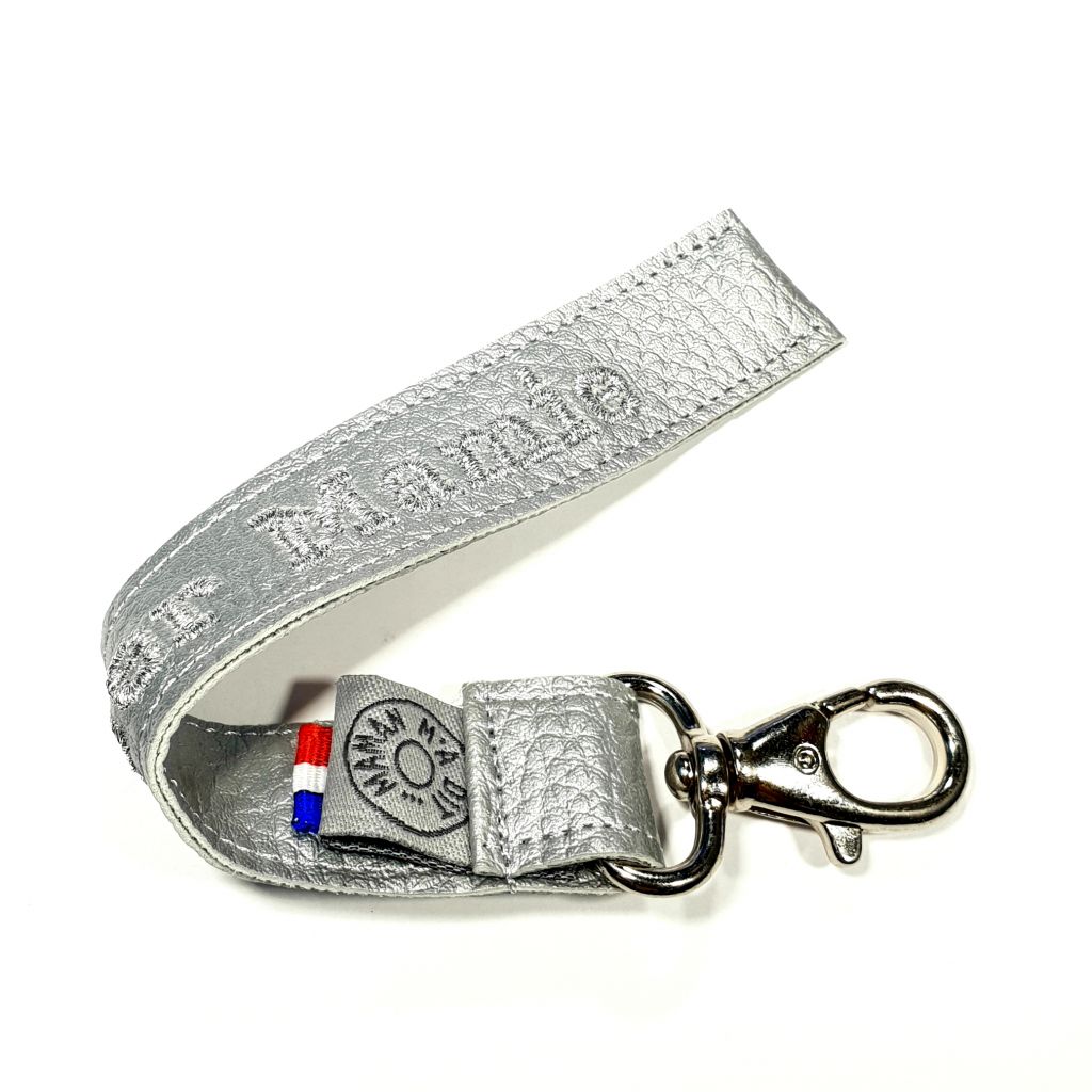 Broderie au choix possibilité d'ajouter un petit dessin. Choisissez la couleur du simili cuir ainsi que la couleur de la broderie. Sur ce modèle, le simili est argent, la broderie grise