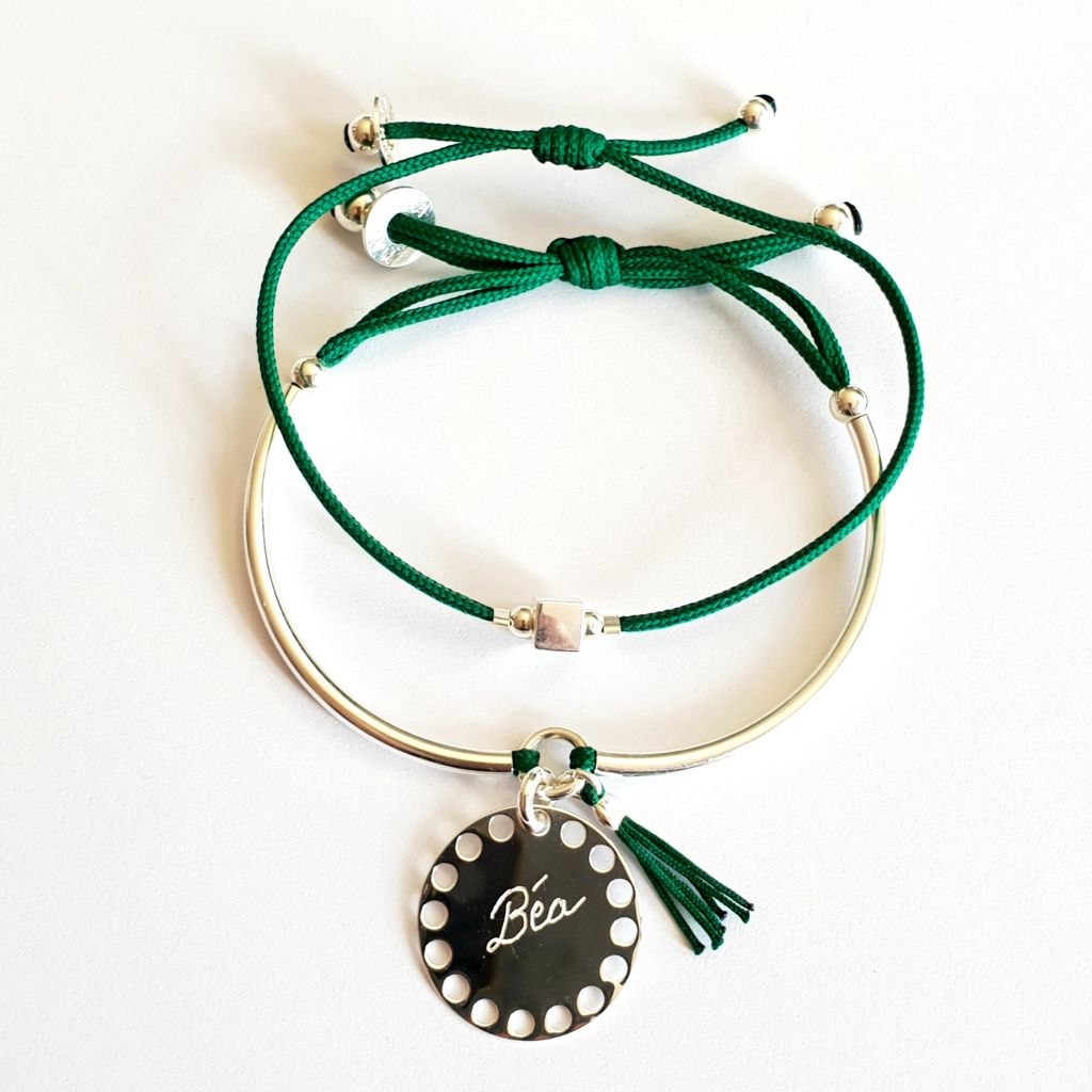 Duo demi jonc (nouveaux de 2025 plus épais et plus résistants), médaille 20 mm et bracelet cube coordonné.