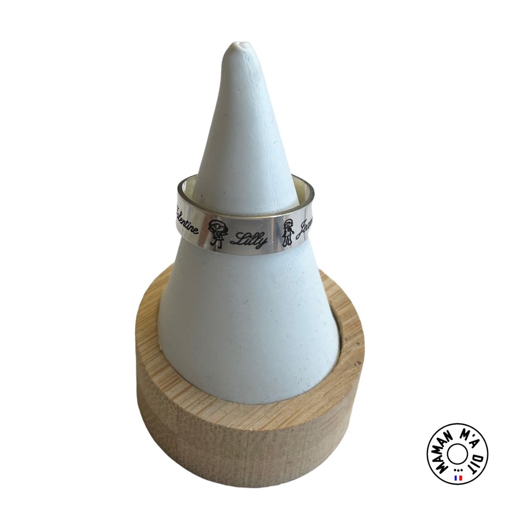 Bague 6 mm en argent . Bague ajustable 50/52 54/56 58/60 62/64 Gravures noircies comprises. Possibilité de graver des prénoms, des dates, vos enfants... à vous de choisir . si vous souhaitez des personnages, indiquez moi dans les commentaires la réf, l'ordre et les prénoms des personnages que vous souhaitez. Exemple : H3 Pierre F1 Louise D7 Marie