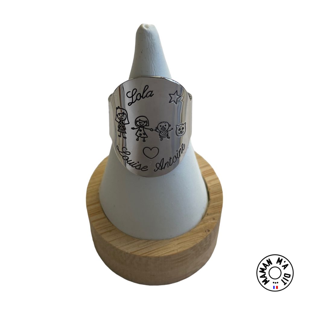Bague sur mesure, dessin au choix. Rond 24 mm, l'anneau mesure 10 mm de large. La bague est fermée (non ajustable). Prévoir une taille au dessus de votre taille habituelle. Bague rhodiée, elle ne s'oxydera pas dans le temps. Indiquez moi dans les commentaires la réf, l'ordre et les prénoms des personnages que vous souhaitez. Exemple : H3 Pierre F1 Louise D7 Marie