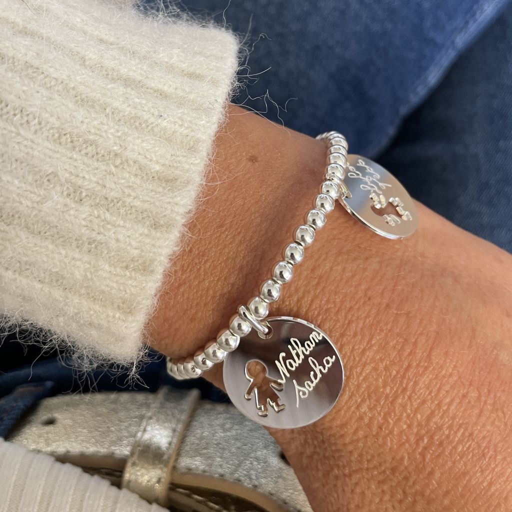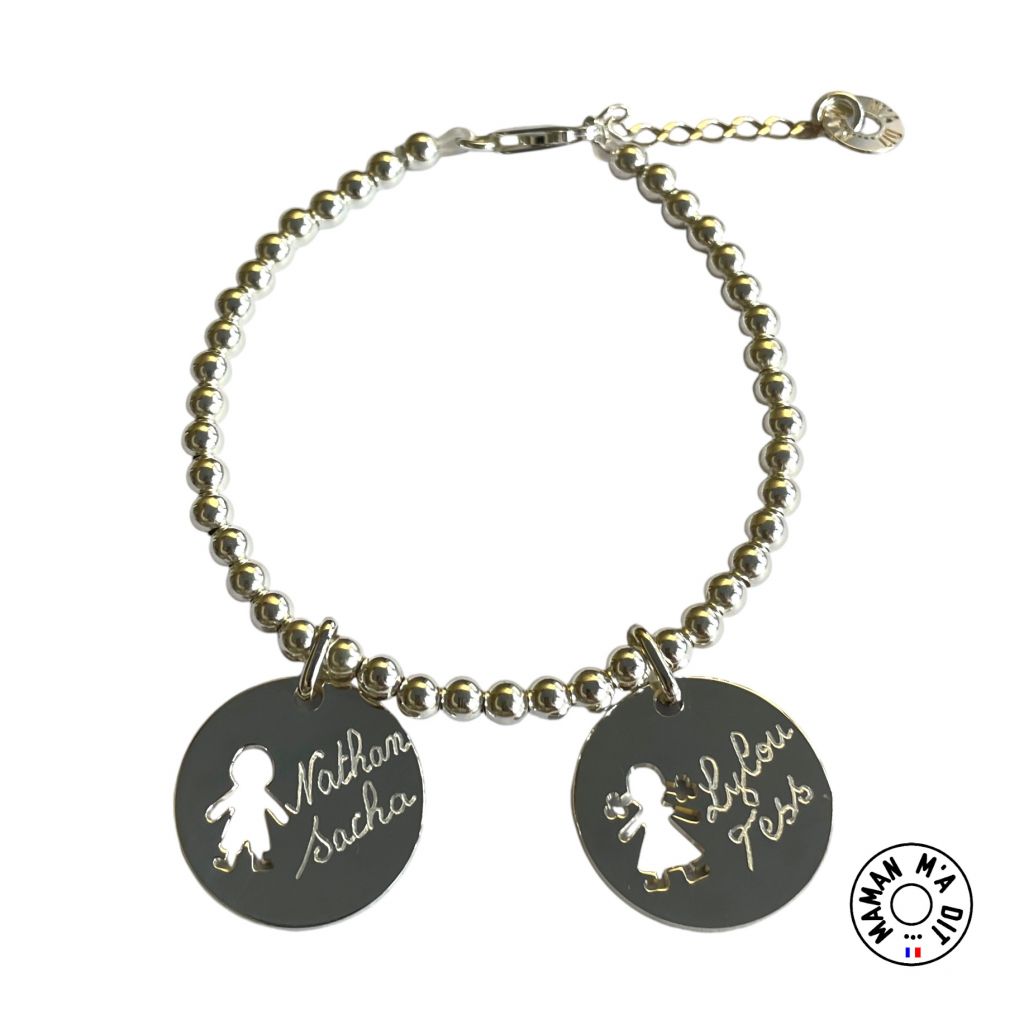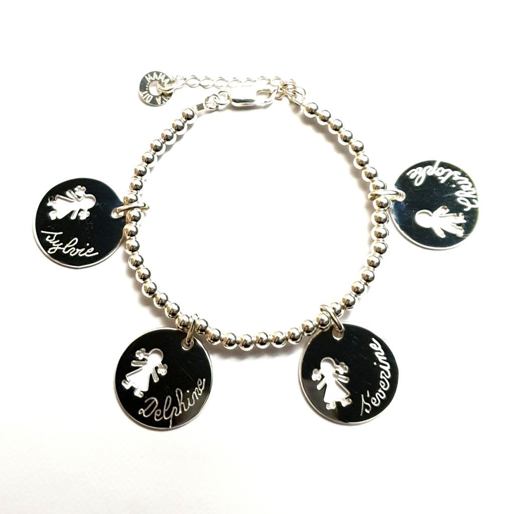• Bracelet perles 4 mm en argent, médailles personnages 20 mm, filles ou garçons (le prix comprend 1 médaille au départ)..