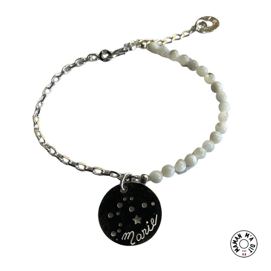 Bracelet chaîne en argent et perles de culture, finition par mousqueton plus chaînette ajustable. Merci de m'indiquer la taille exacte de votre poignet dans les commentaires, j'adapterai le bracelet en fonction. Médaille constellation, signe au choix. Possibilité de graver la médaille constellation.