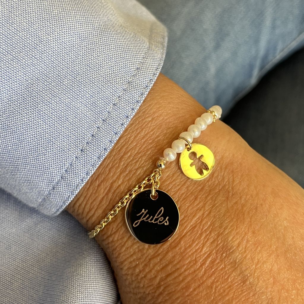 Bracelet médaille ronde 15 mm sur chaine et perles de culture et chaîne