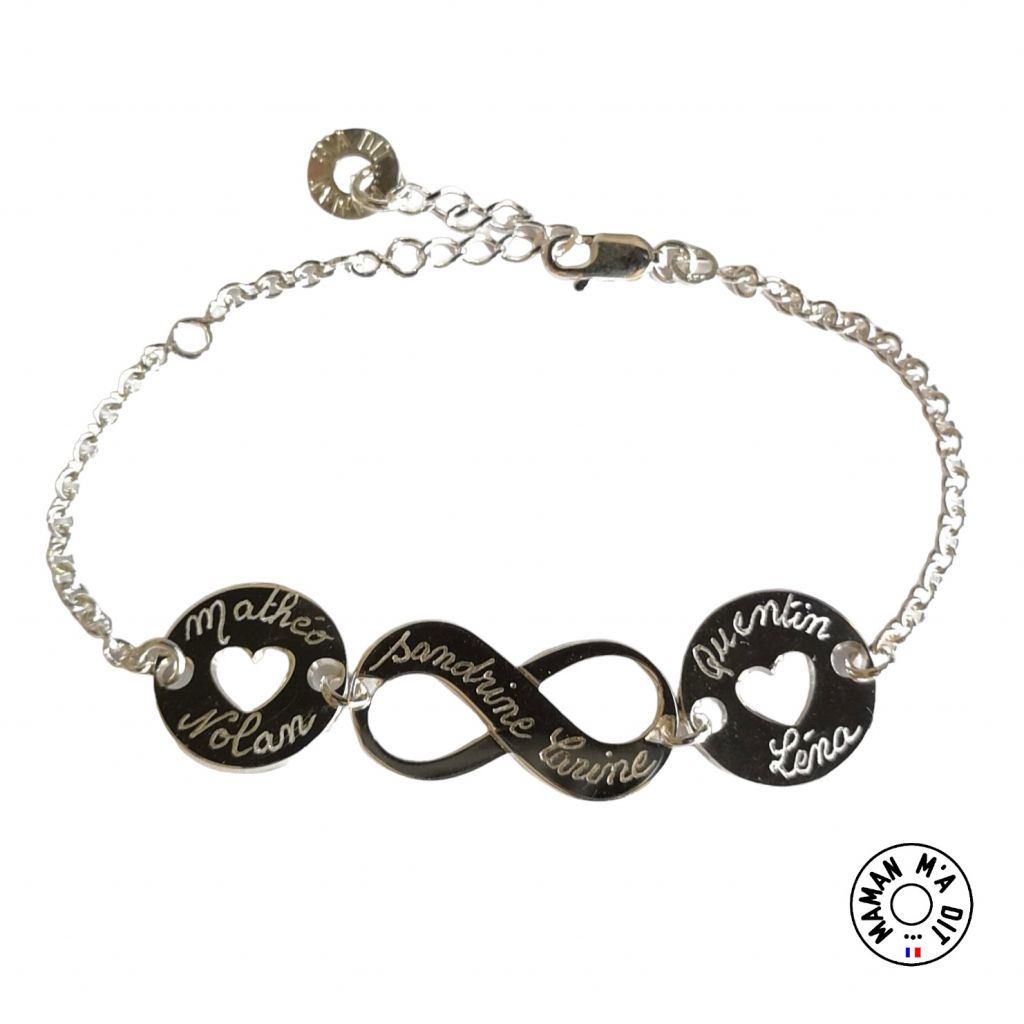 Bracelet chaîne, infini et 2 coeurs en argent massif