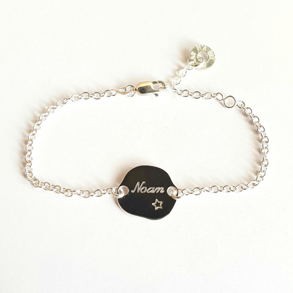 Gourmette galet étoile gravée, prénom au choix. Gravure offerte du prénom, police anglaise pour les filles et lettres batons pour les garçons. Si vous avez une préférence merci de me le préciser dans les commentaires, de même que la taille exacte au plus serré du poignet j'adapterai ainsi parfaitement le bracelet.