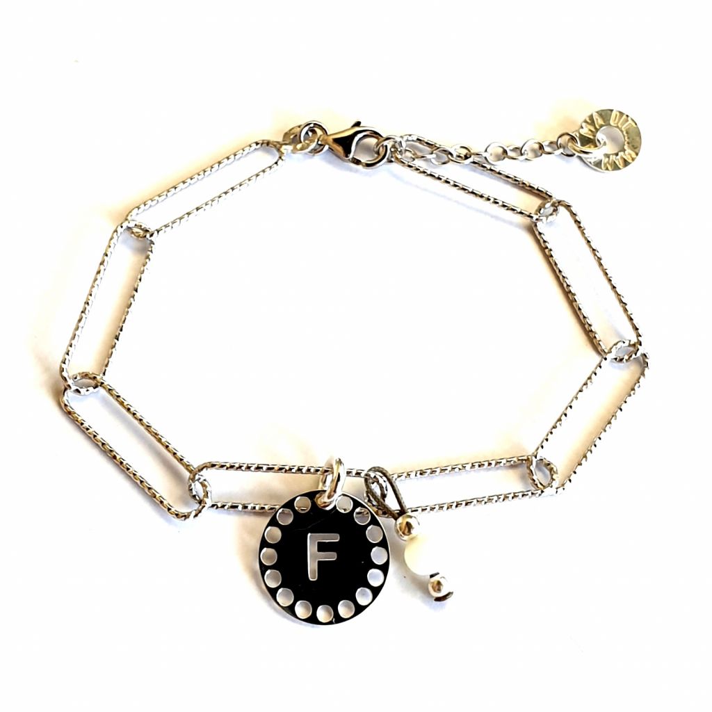 Bracelet cible ronde 14 mm avec lettre ajourée au choix. Chaine maillons rectangle 18 cm et pompon perle couleur au choix. Sur la photo la perle est en nacre naturelle. Ce bracelet n'est pas gravable