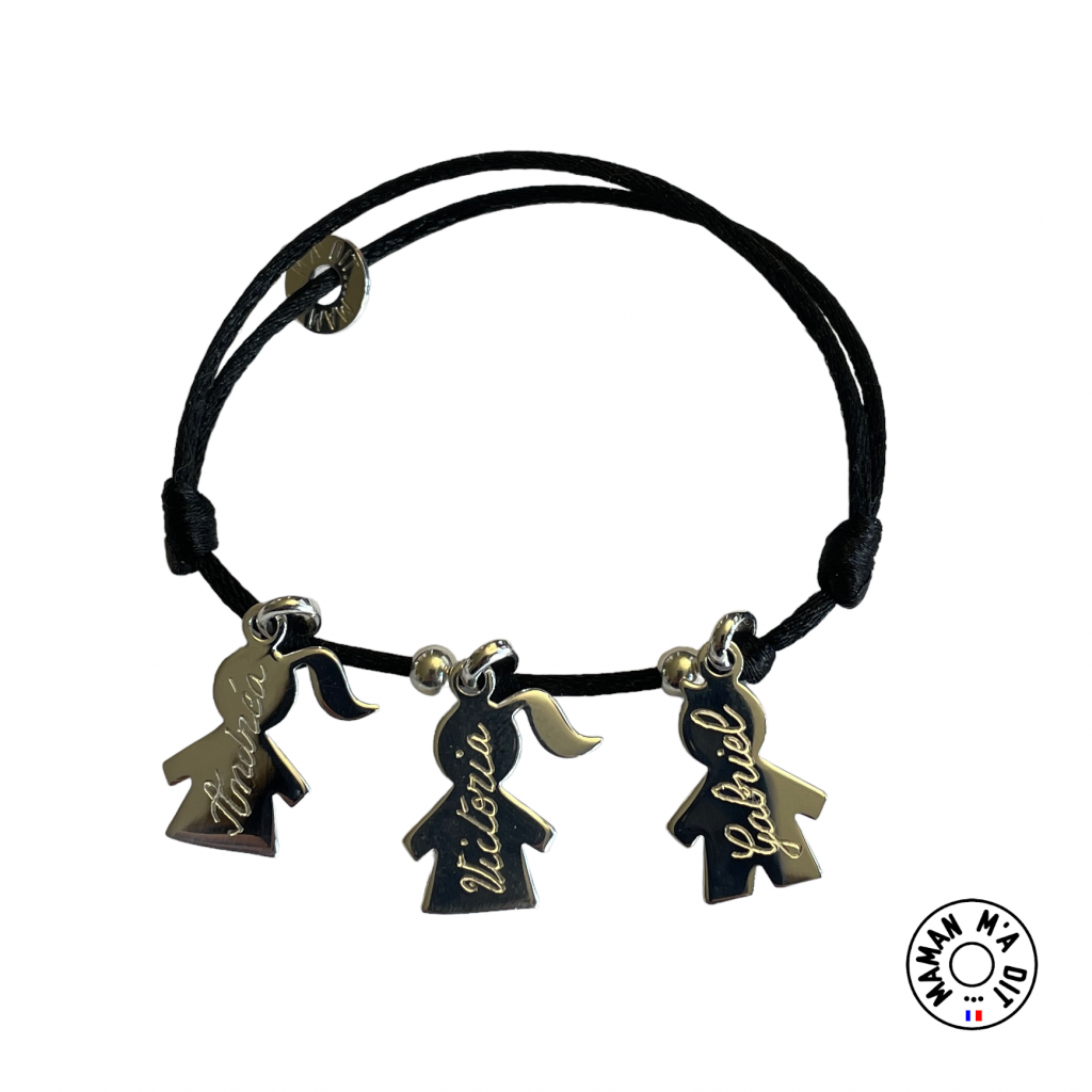 Bracelet 2 à 6 personnages 16 mm séparés d'une perle. Le prix tient compte de 2 personnages et une perle séparatrice Finition polyester 1 noeud coulissant 2 perles en option