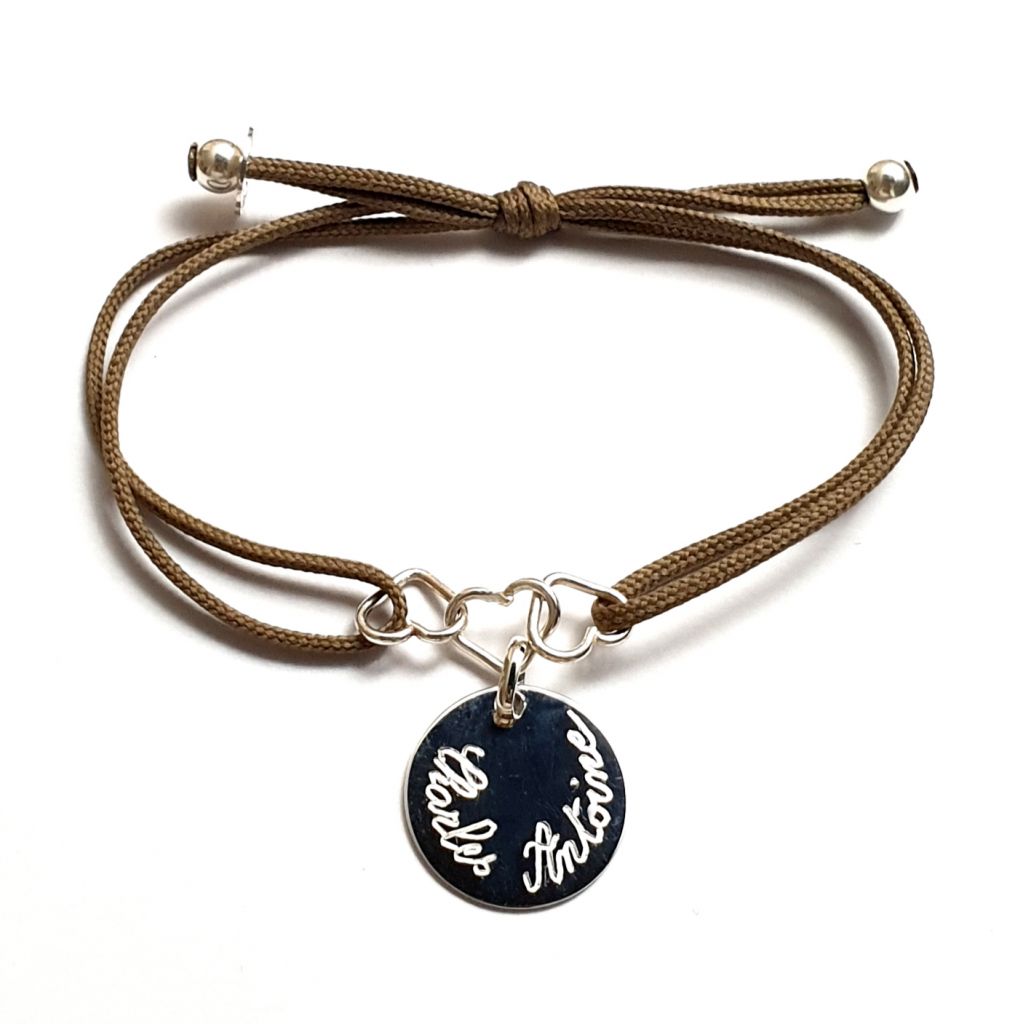 Bracelet 3 coeurs entrelacés, médaille ronde 17 mm Montage sur cordon polyester 1 nœud coulissant et 2 perles.