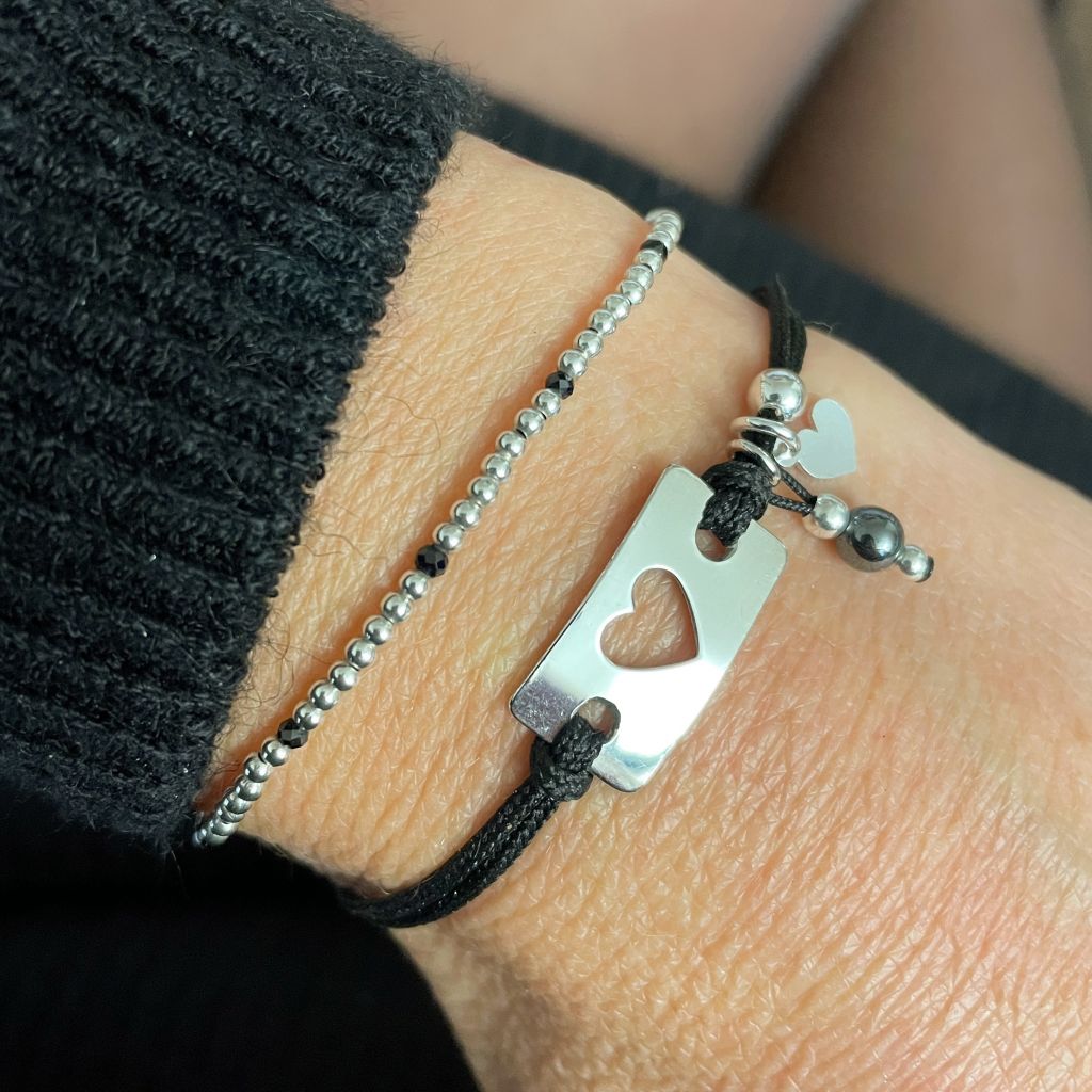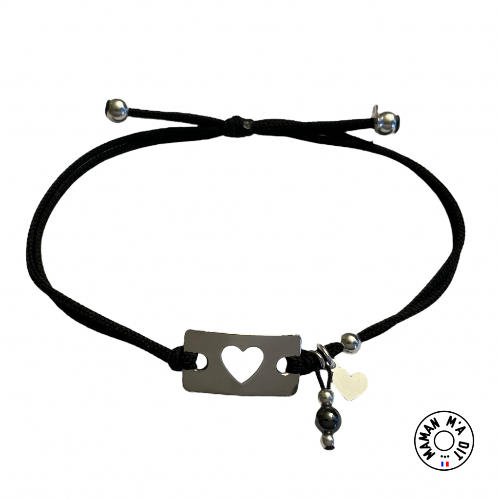 Bracelet plaque coeur 10 x 20 mm mini coeur et pompon coordonné au cordon. Finition polyester perles, très pratique à mettre et à retirer Possibilité de graver un prénom court (5 lettres sur la médaille rectangle) D’autres modèles sont possibles (infini, fille, garçon) avec mini médaille coordonnée