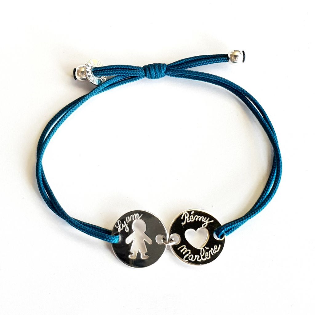 Bracelet avec une médaille ronde 15 mm (fille ou garçon) et un coeur 15 mm fabriqués en France.