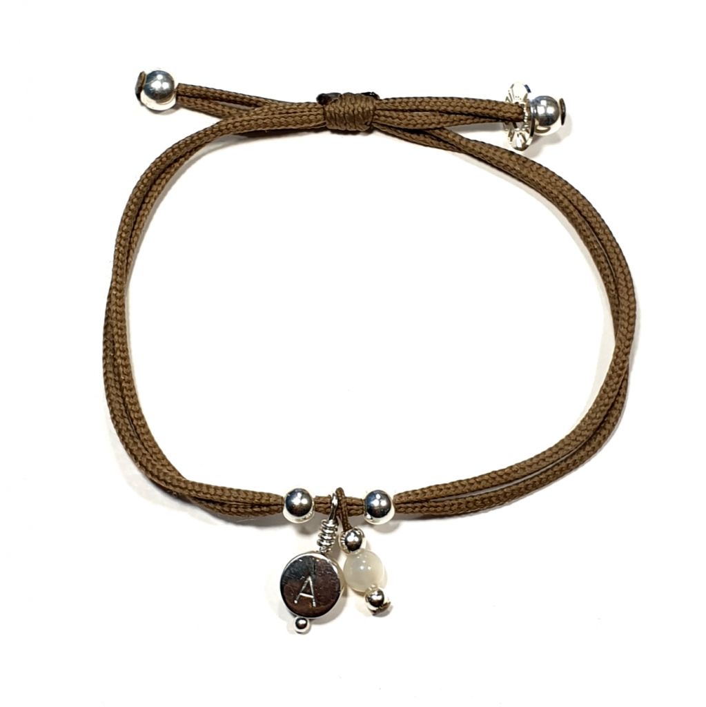 Bracelet palais 7 mm lettre au choix pompon perle de culture Montage sur cordon polyester 1 nœud coulissant et 2 perles. Possibilité d'ajouter des palais et des mini médailles, le prix tient compte des perles séparatrices.