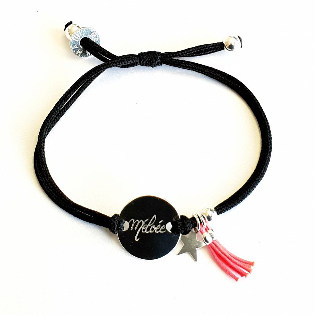 Jeton 15 mm, 1 mini au choix et 1 pompon. Montage sur cordon polyester 1 nœud coulissant et 2 perles.