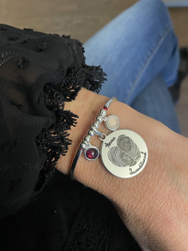 Bracelet pendentif 24 mm, 2 empreintes entrelacées en forme de coeur. Montage sur demi jonc (nouveaux de 2025 plus épais et plus résistants) Gravures au choix