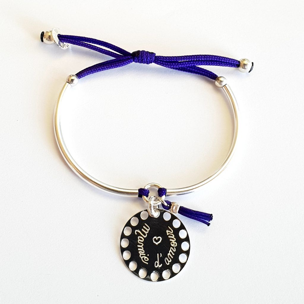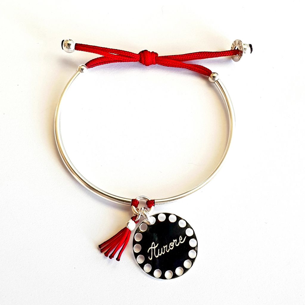 Bracelet médaille ronde ajourée montée sur 2 demi joncs (nouveaux de 2025 plus épais et plus résistants) . Ce bracelet convient à toute les tailles de poignets, les demi joncs sont sur mesures. Pompon couleur au choix