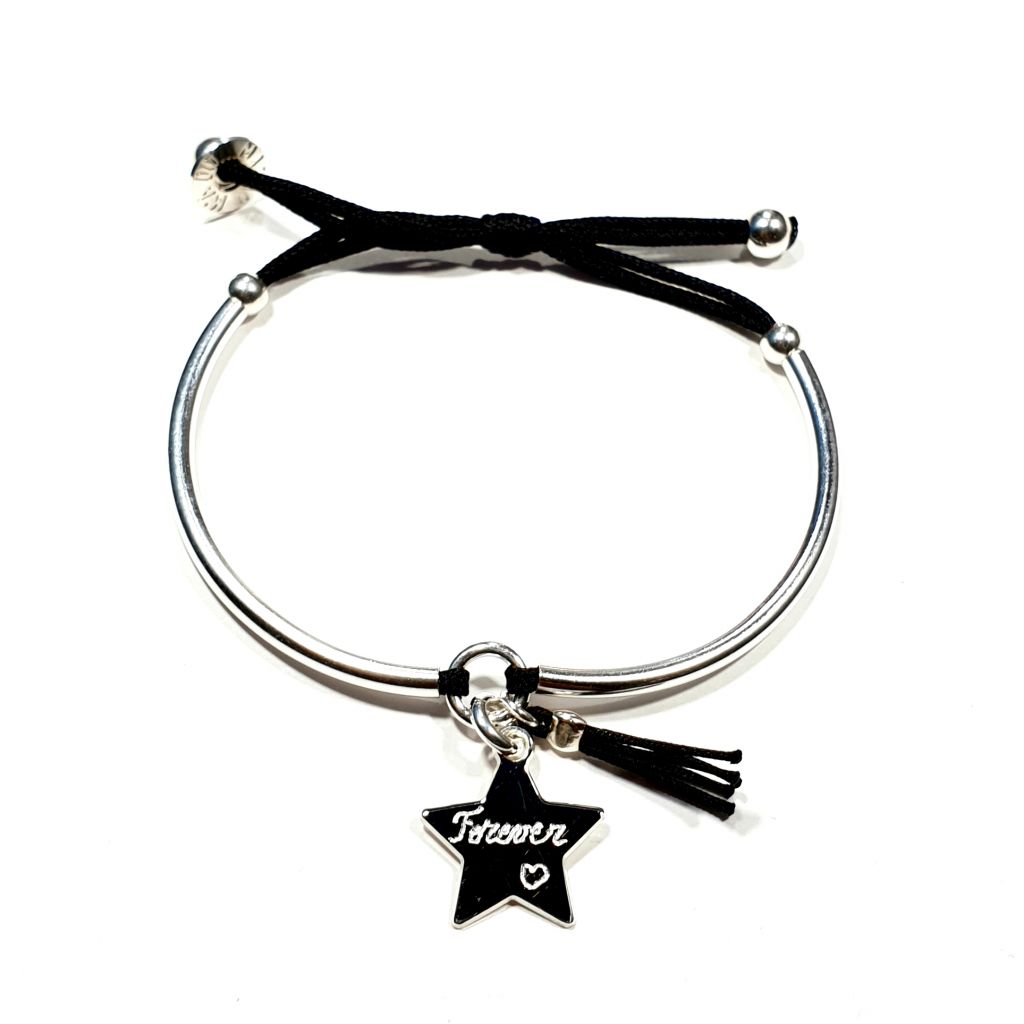 Bracelet étoile 15 mm monté sur 2 demi joncs (nouveaux de 2025 plus épais et plus résistants). Ce bracelet convient à toute les tailles de poignets, les demi joncs sont sur mesures. Etoile gravable, pompon couleur au choix