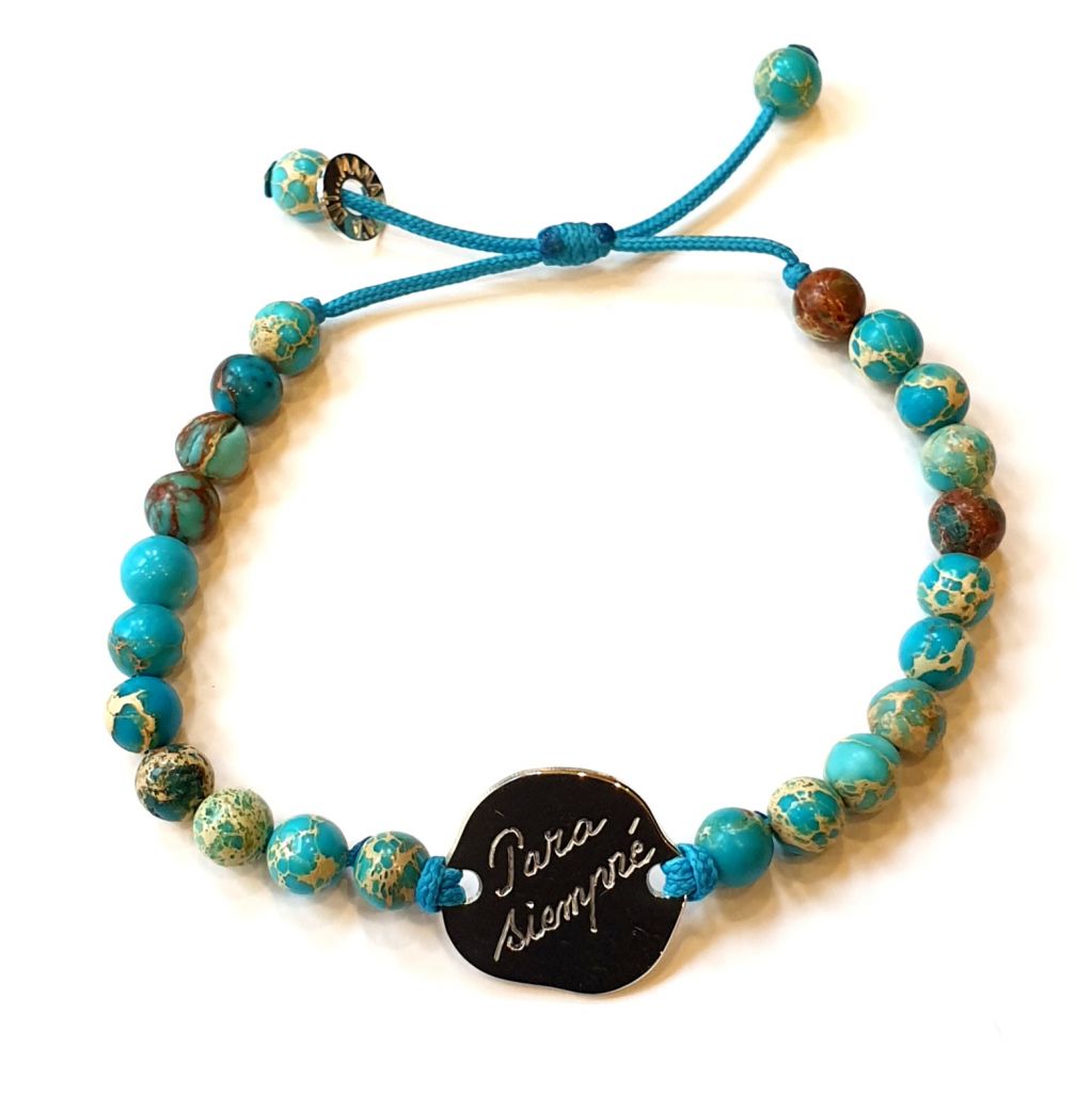 Bracelet galet rond gravure au choix montage sur perles turquoise. Si vous souhaitez une autre couleur de perles n'hésitez pas à me le préciser dans les commentaires.