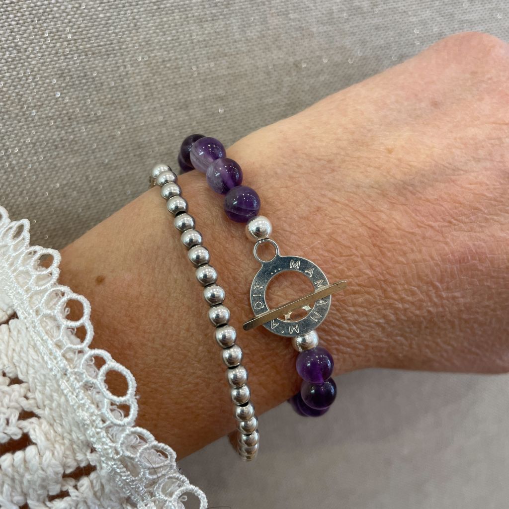 Bracelet perles Amethyste 6 mm finition cordon élastique 2 perles et fermoir Maman m'a dit argent ou plaqué or Retrouvez toutes les vertus des pierres ici https://www.mamanmadit.com/gems-vertus-pierres-roanne/