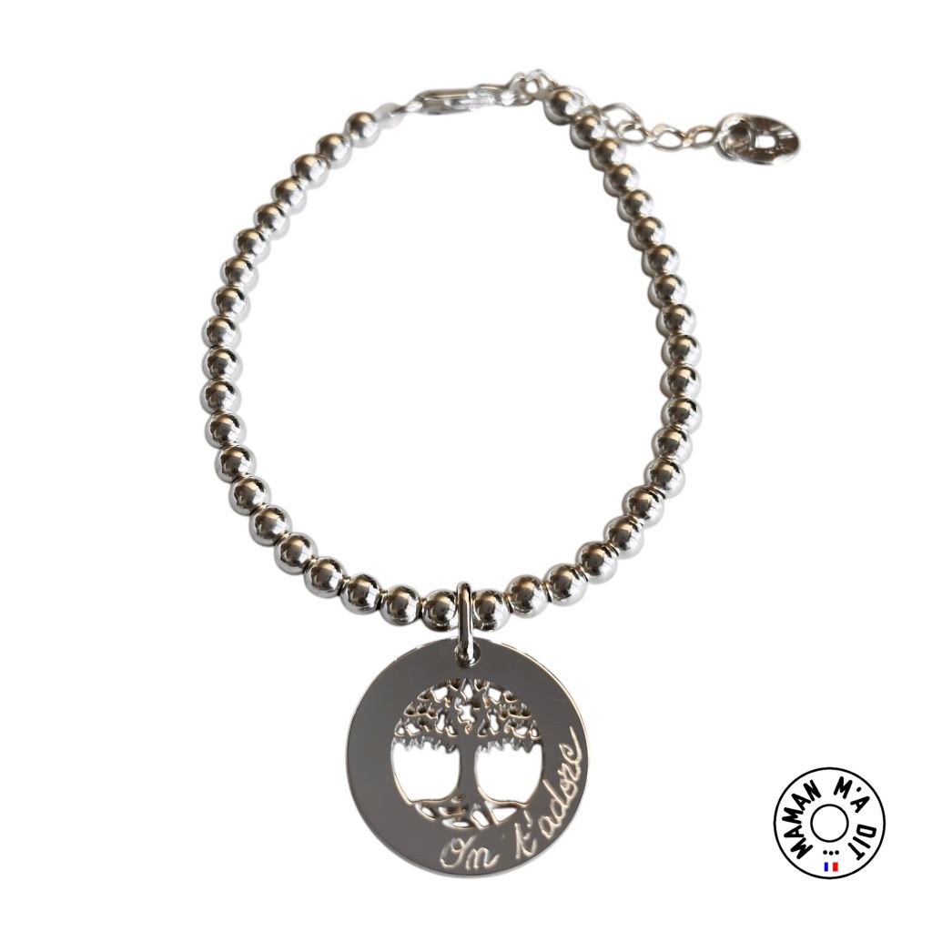 Bracelet perles 4 mm et arbre de vie 20 mm, gravure au choix.