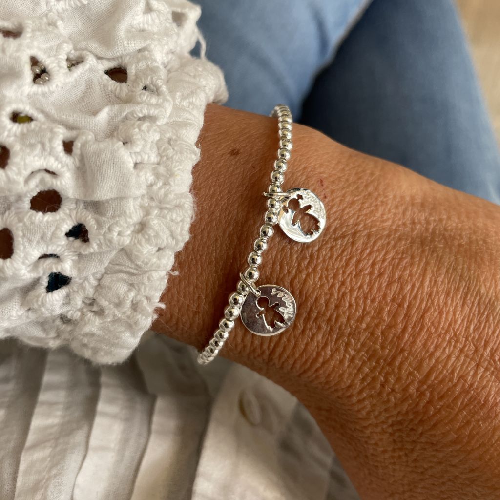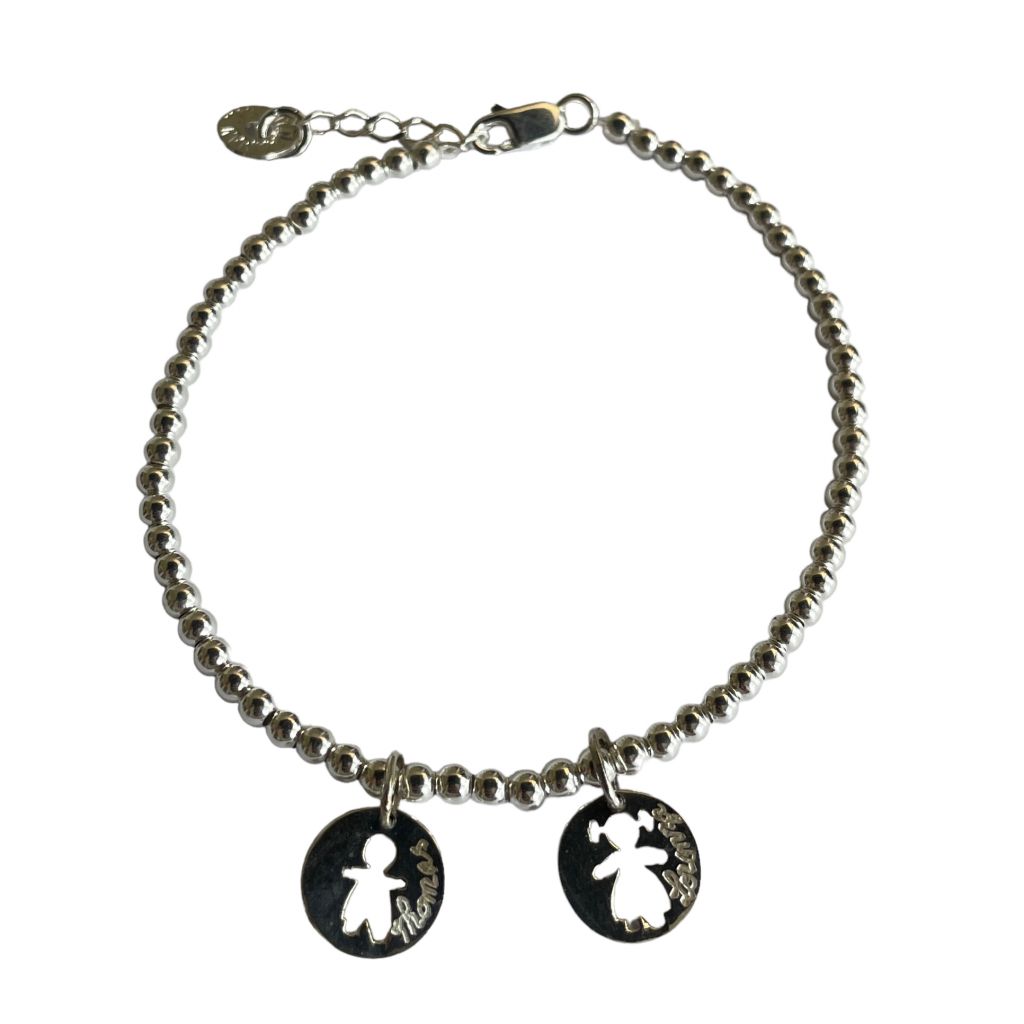 Bracelet perles 3 mm en argent. Finition mousqueton ajustable 2 médailles fille ou garçon 10 mm, je peux graver une lettre majuscule ou un prénom très court Possibilité d'ajouter des médailles Vous pouvez également craquer pour la parure https://www.mamanmadit.com/nouveaute-9/parure-femme-bijoux-roanne.html