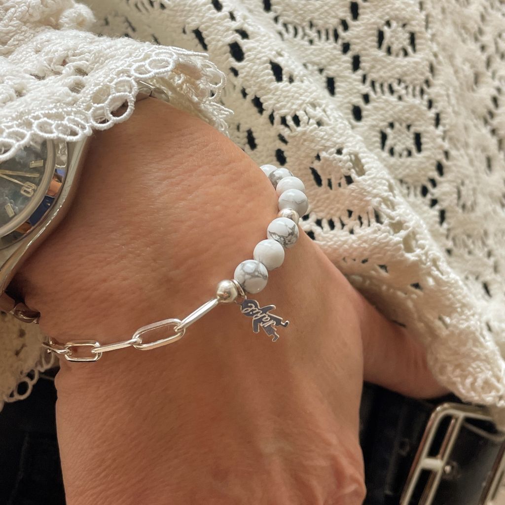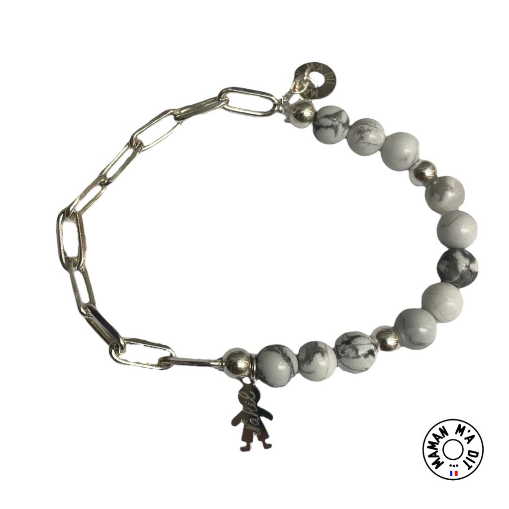 Bracelet perles Howlite 6 mm sur la photo, finition cordon élastique avec chaine 1 mini médaille. Possibilité d'ajouter des minis médailles et de choisir d'autres perles Retrouvez toutes les vertus des pierres ici https://www.mamanmadit.com/gems-vertus-pierres-roanne/