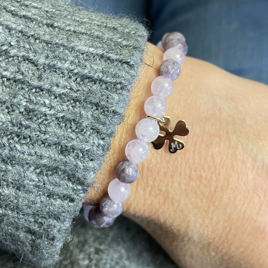 Bracelet trèfle 11 mm perles Tourmaline et Quartz Rose 6 mm finition 1 noeud coulissant ajustable Retrouvez toutes les vertus des pierres ici https://www.mamanmadit.com/gems-vertus-pierres-roanne/ Possibilité de graver 3 initiales sur le tréfle