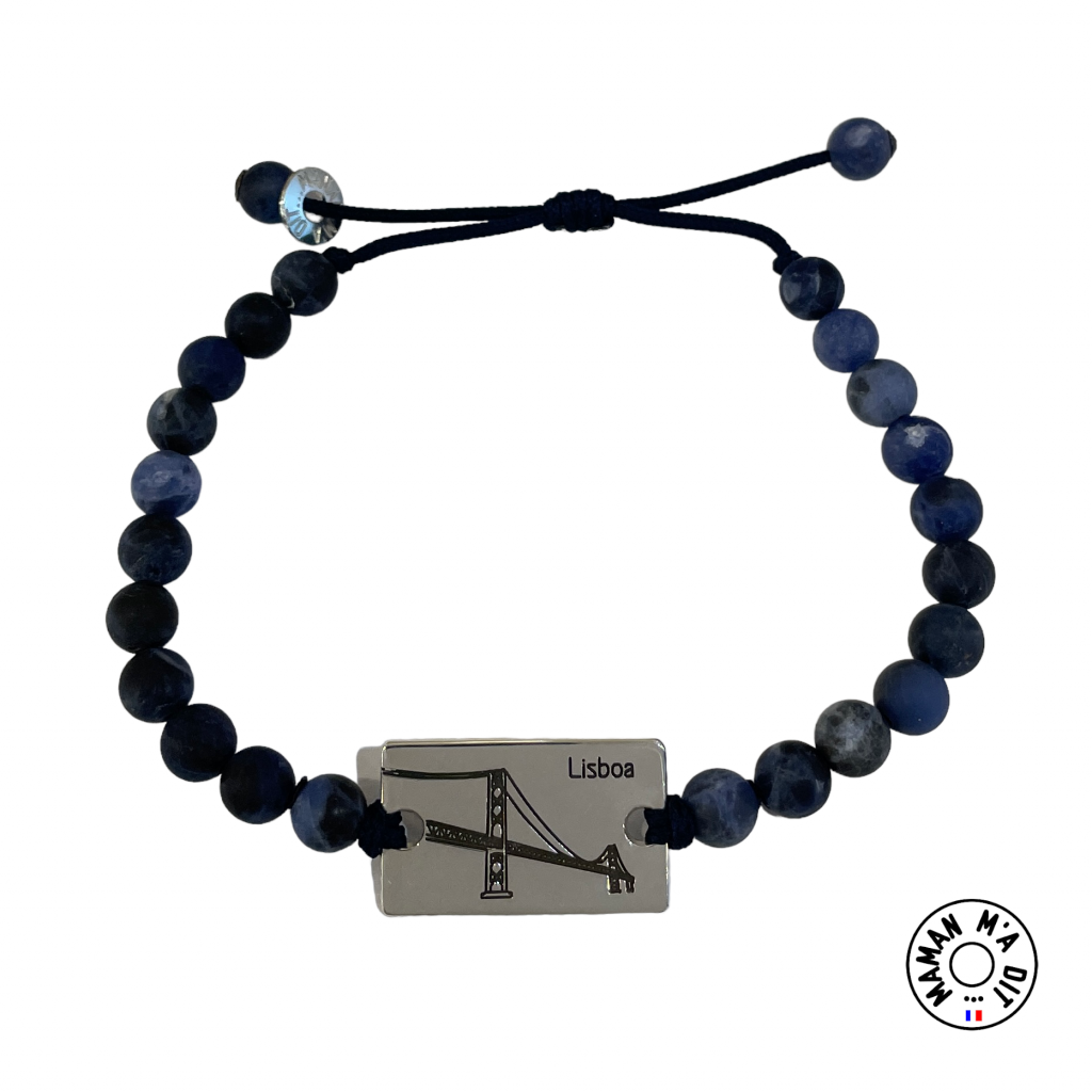 Bracelet perles 6 mm médaille rectangle 15x25 pont de Lisbonne