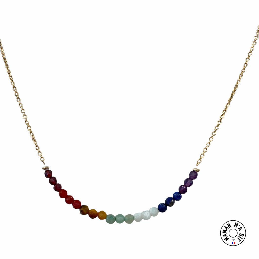 Le collier 7 chakras est un talisman bouddhiste d’harmonie et de pouvoir. Il procure une certaine harmonie et une énergie vitale et spirituelle au corps et à l’esprit.  Le collier est constitué d’une série de 7 pierres naturelles de différente couleur (grenat / cornaline / œil de tigre / aventurine / Amazonite / lapis-lazuli et améthyste.) et il correspond aux sept points de chakras de notre organisme.  Quand ils sont réunis tous ensemble comme sur un bracelet, ils sont supposés avoir une influence positive sur l’ensemble de notre corps et de notre esprit.