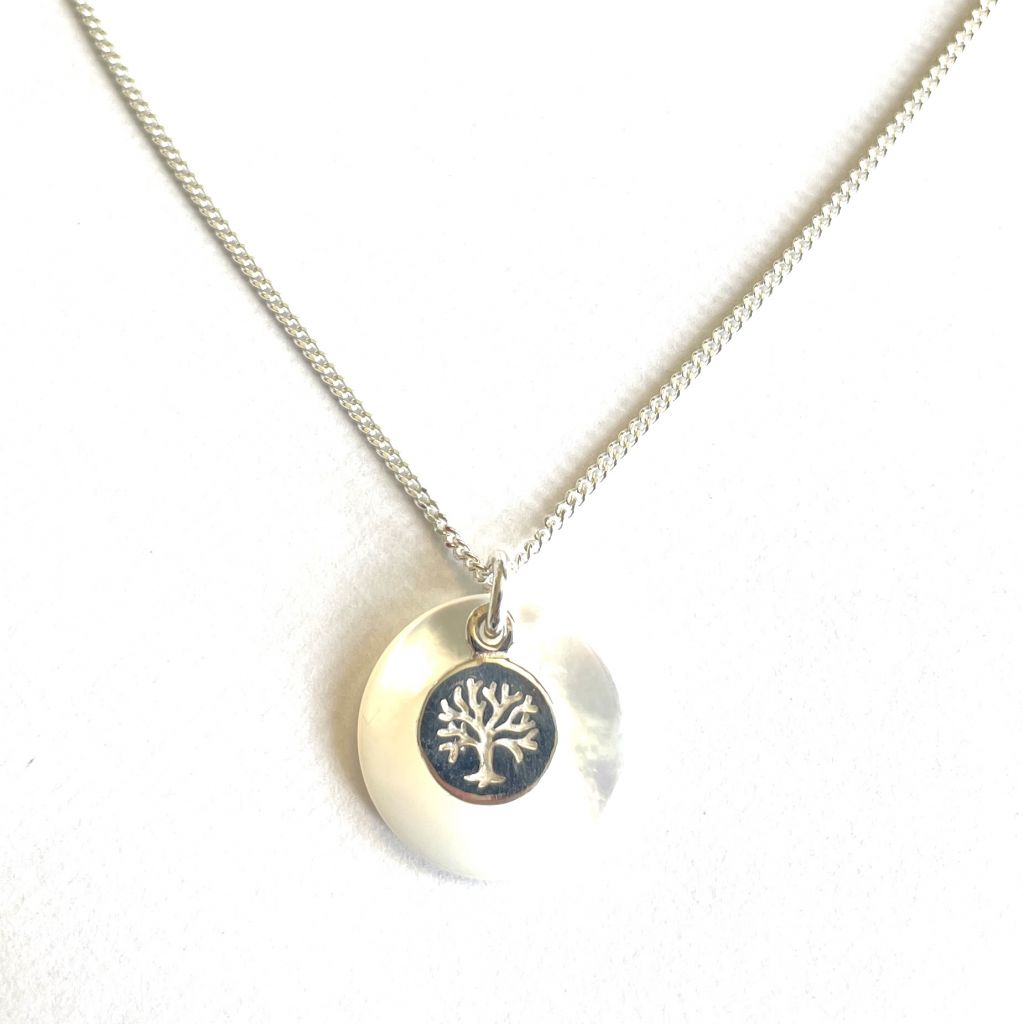 Collier mini arbre de vie sur nacre naturelle 15 mm ivoire. Chaîne fine figaro longueur au choix.