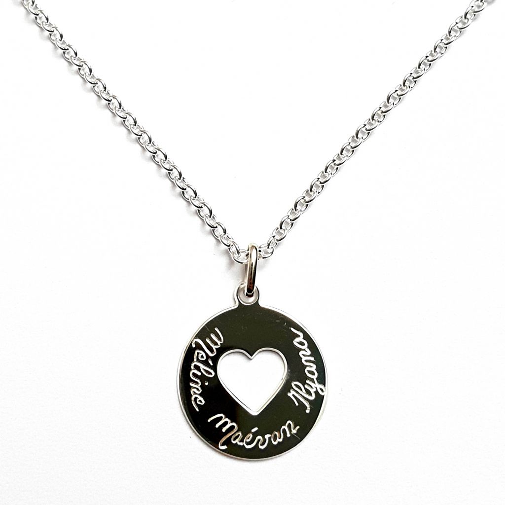 Collier médaille coeur 21 mm, possibilité de graver plusieurs prénoms. Chaine jaseron 40 cm, maillon de rappel à 42 cm et chainette 45 cm