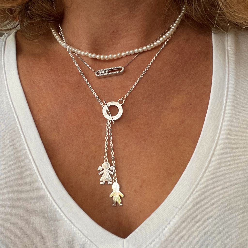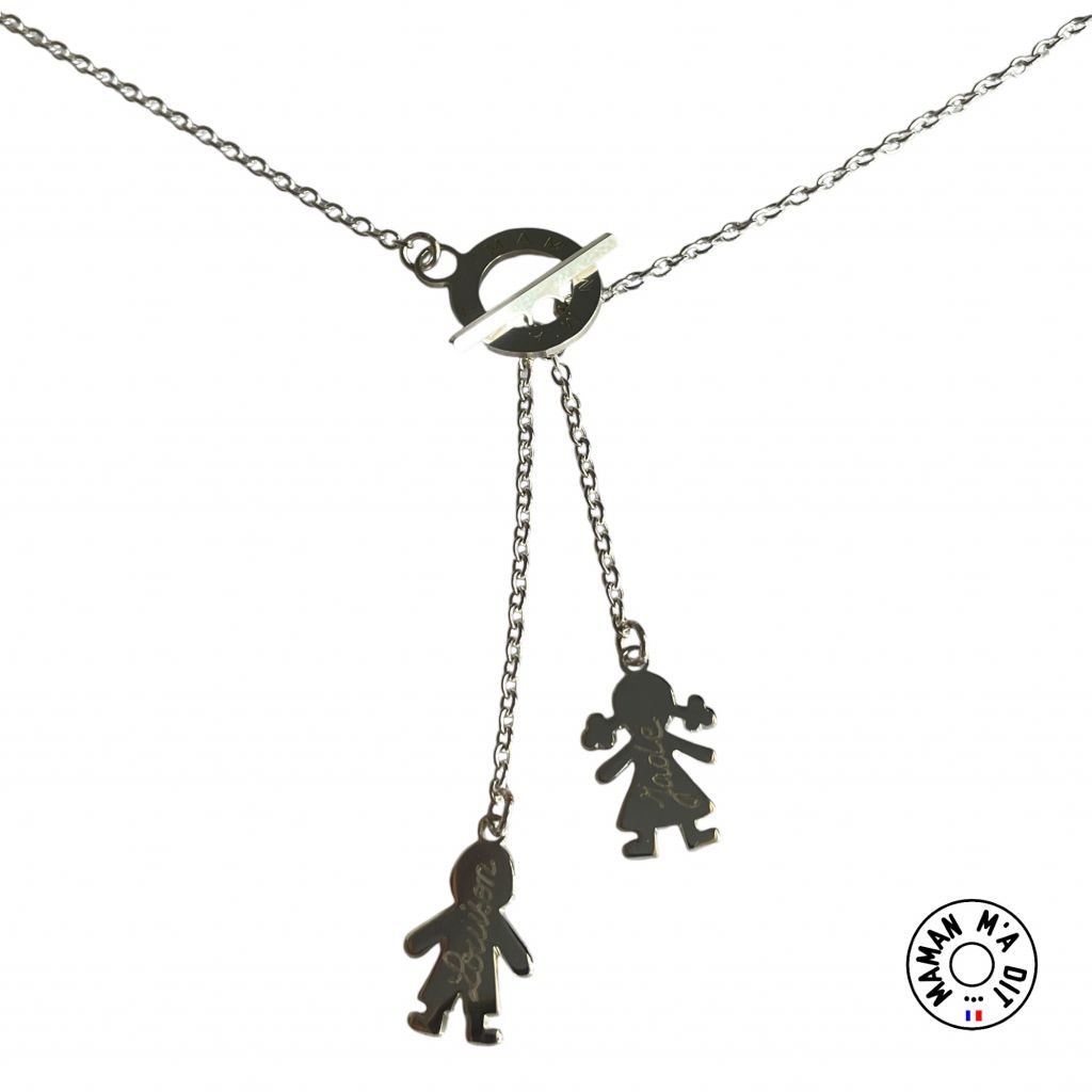 Collier sur chaîne ajustable,  fermoir MMAD auquel sont rattachés 2 personnages 15 mm.
