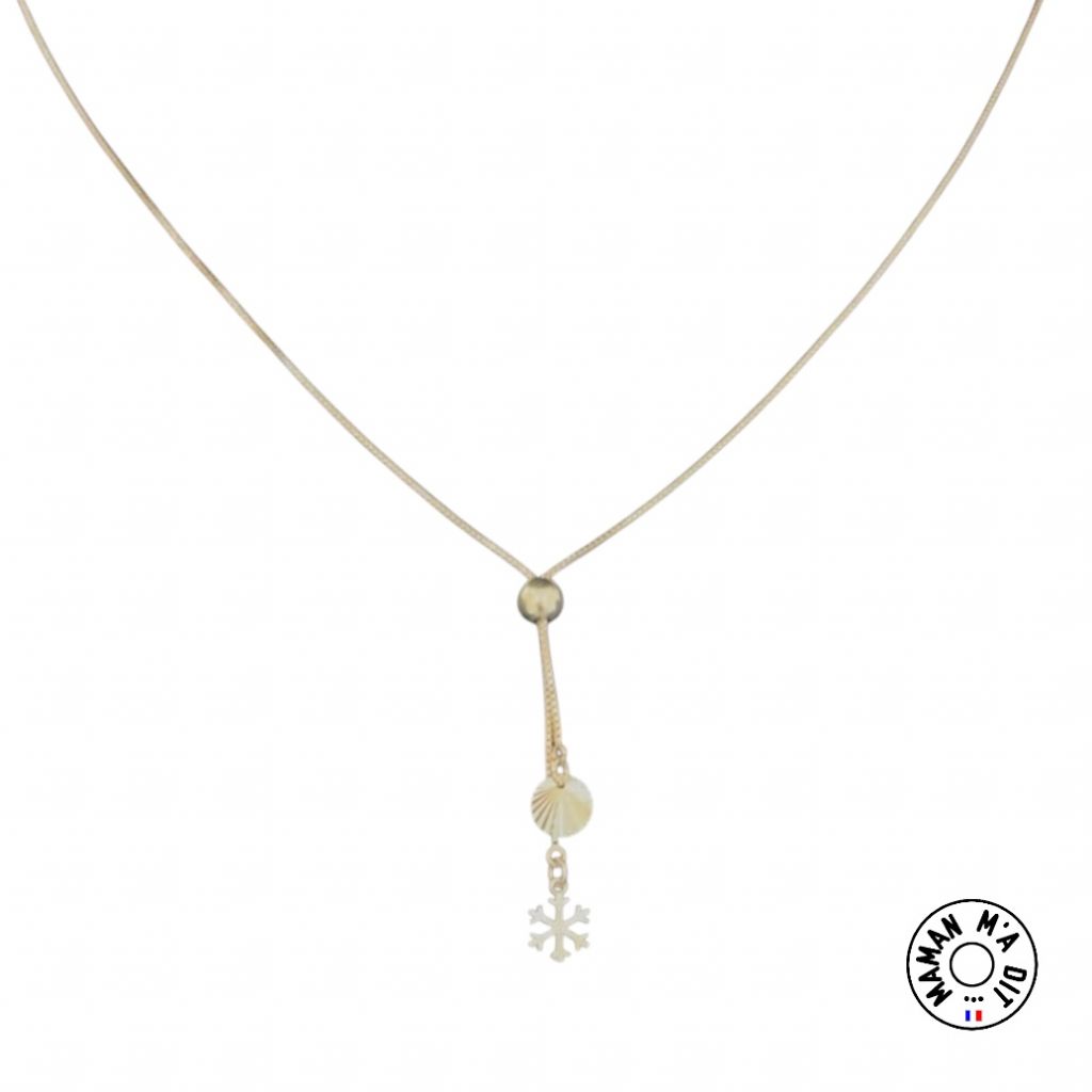 Collier chaîne vénitienne 60 cm sans fermoir (le collier s'enfile par la tête, ne convient pas aux "têtes larges"). Flocon et médaille ronde striée non gravables.