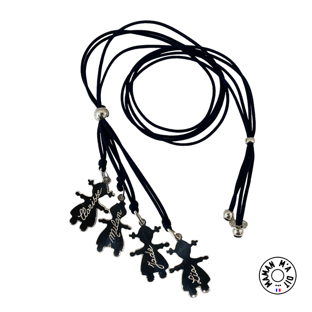 Collier 2 à 4 personnages 25 mm (fille ou garçon) montés sur cordon polyester finition perles dans la nuque comprise (très pratique pour mettre, retirer et régler la hauteur du collier).