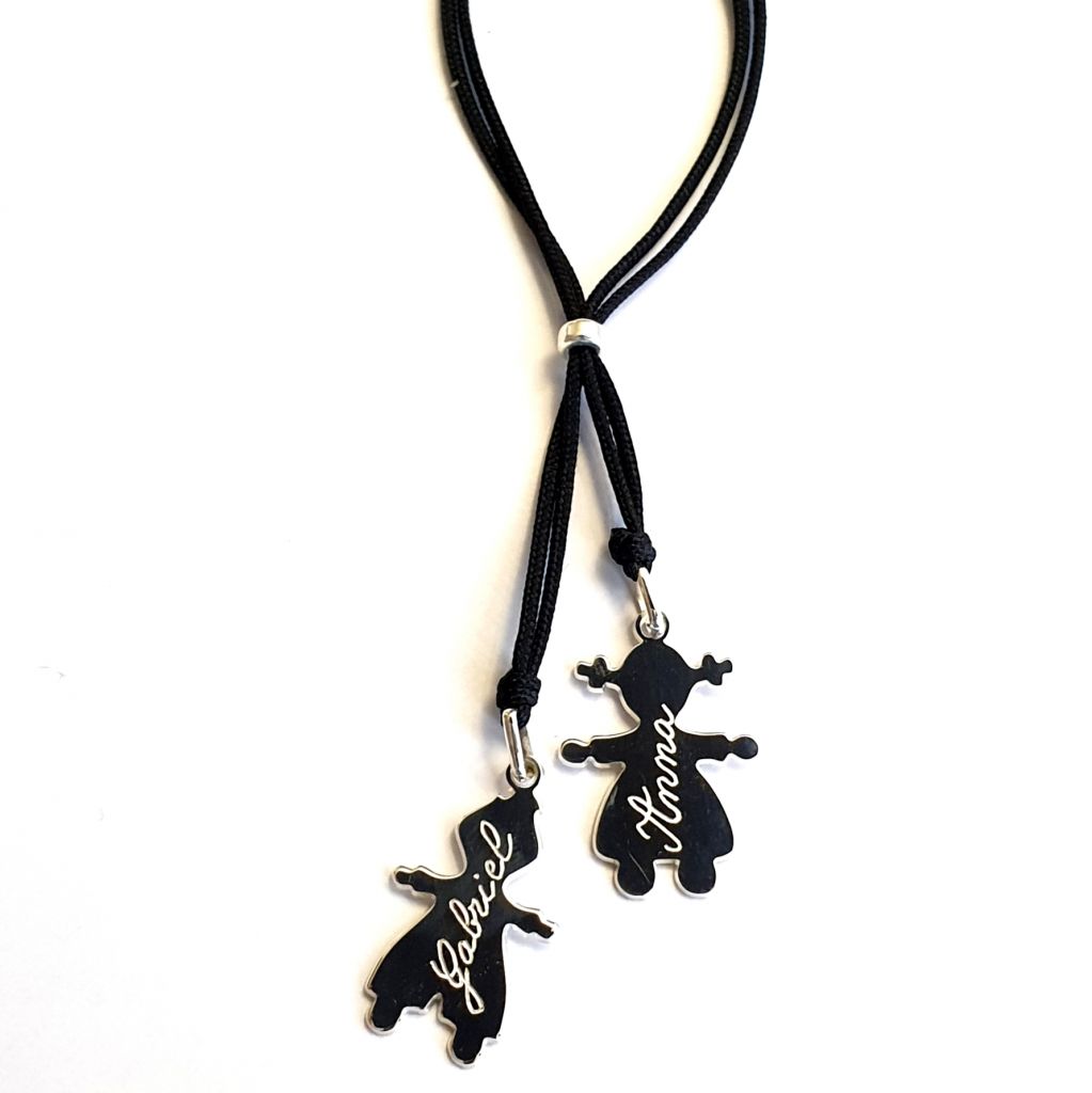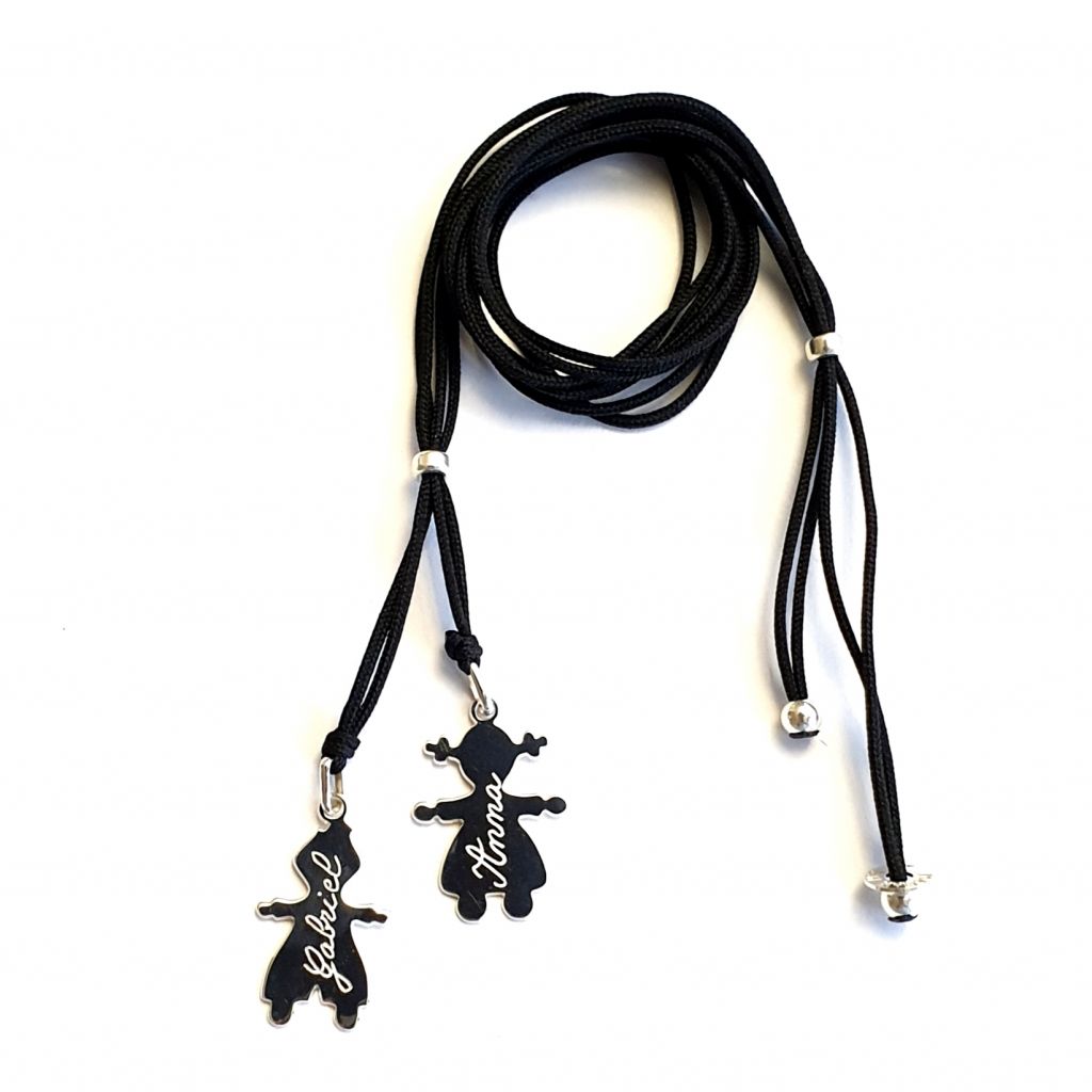 Collier 2 personnages 25 mm (fille ou garçon) montés sur cordon polyester. Finition 3 perles dans la nuque, très pratique pour mettre, enlever et régler la hauteur du collier.