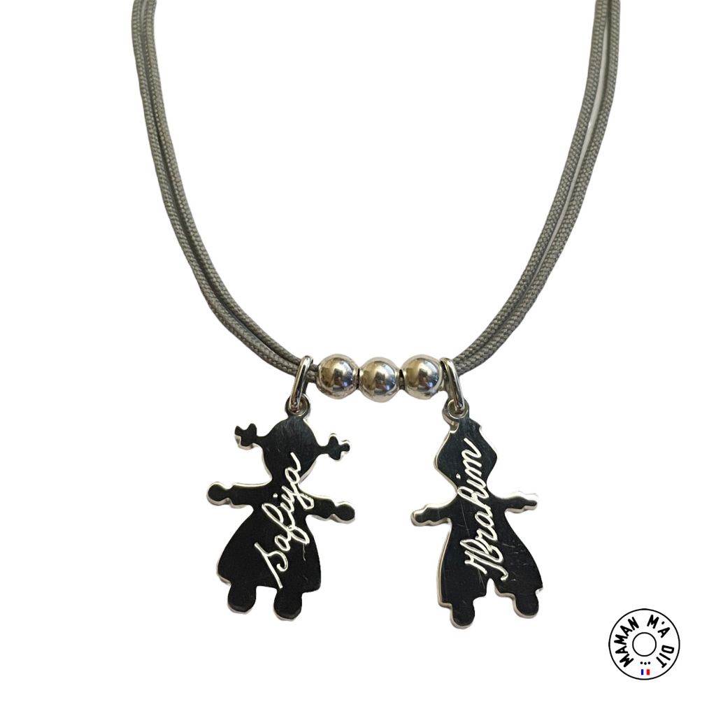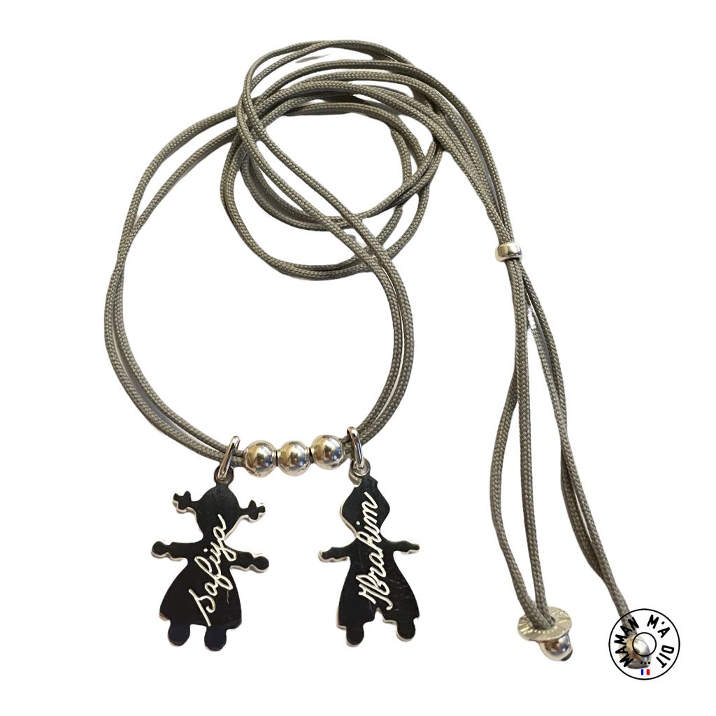 Collier 2 personnages 25 mm avec perles separatrices et finition perles dans la nuque. Possibilité d'ajouter des personnages le prix tient compte des perles séparatrices