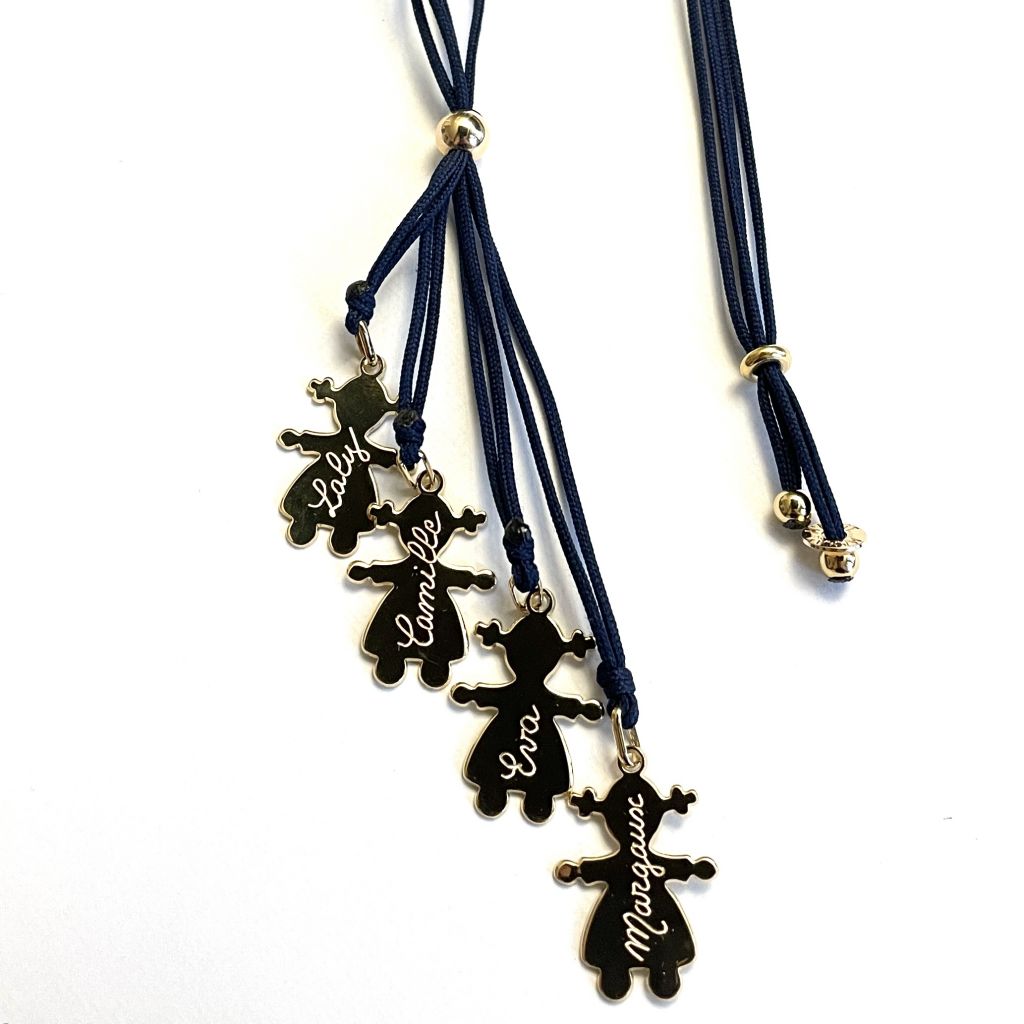 Collier 3 personnages 25 mm (fille ou garçon) montés sur cordon polyester. Finition 3 perles dans la nuque, très pratique pour mettre, enlever et régler la hauteur du collier. Possibilité de rajouter des personnages (le prix du collier correspond à 3 personnages)