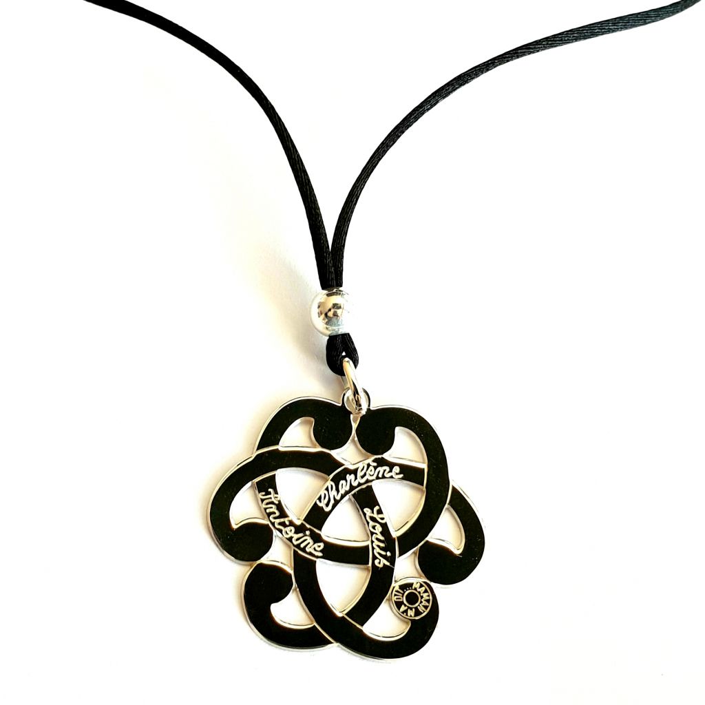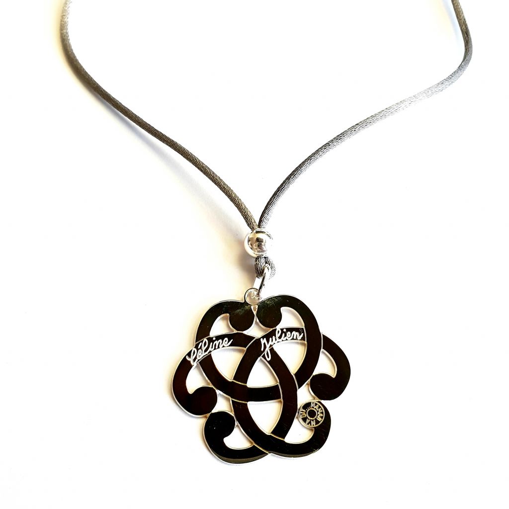 Collier arabesque 40 mm monté sur cordon avec perle. Gravures offertes jusqu'à 5 prénoms.