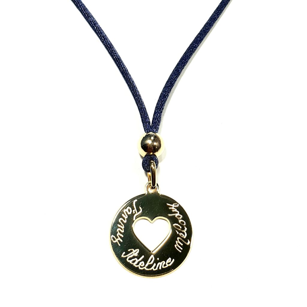 Collier cœur évidé médaille ronde 21mm perle monté sur cordon.