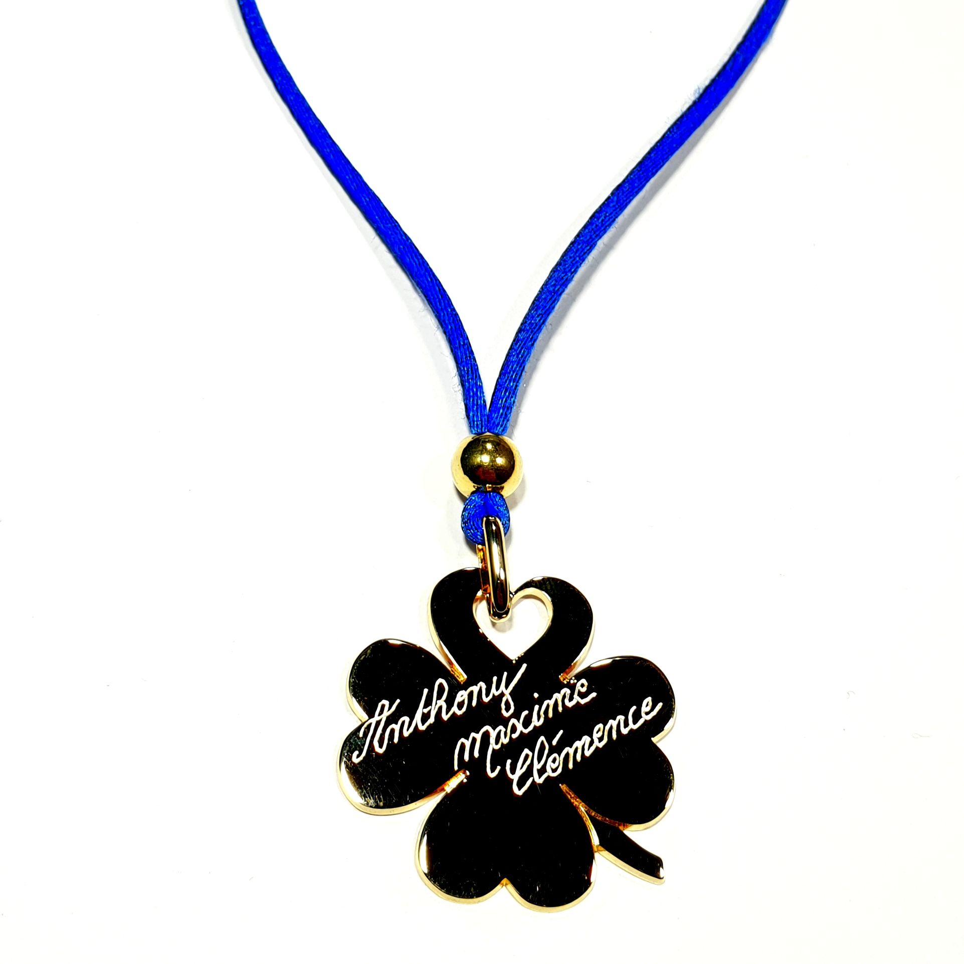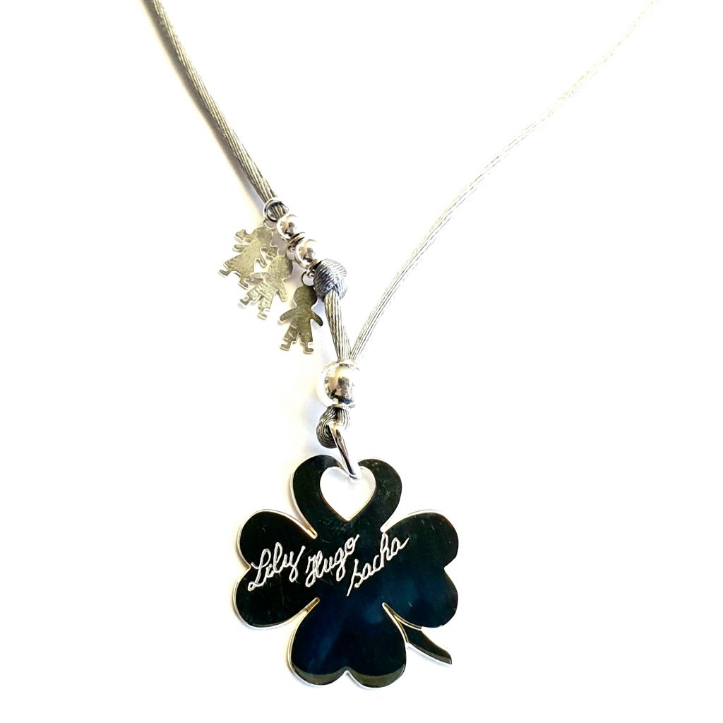 Collier trèfle 30 mm 1 perle 8 mm afin de bloquer le cordon (cela évite que les noeuds situés dans la nuque ne tombent sur la médaille). Possibilité d'ajouter des mini médailles.