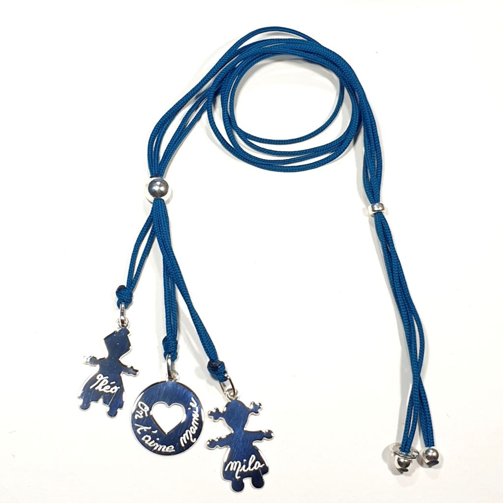 Collier 2 personnages 25 mm 1 coeur 20 mm. Perle au dessus des pendentifs, finition 3 perles dans la nuque comprise