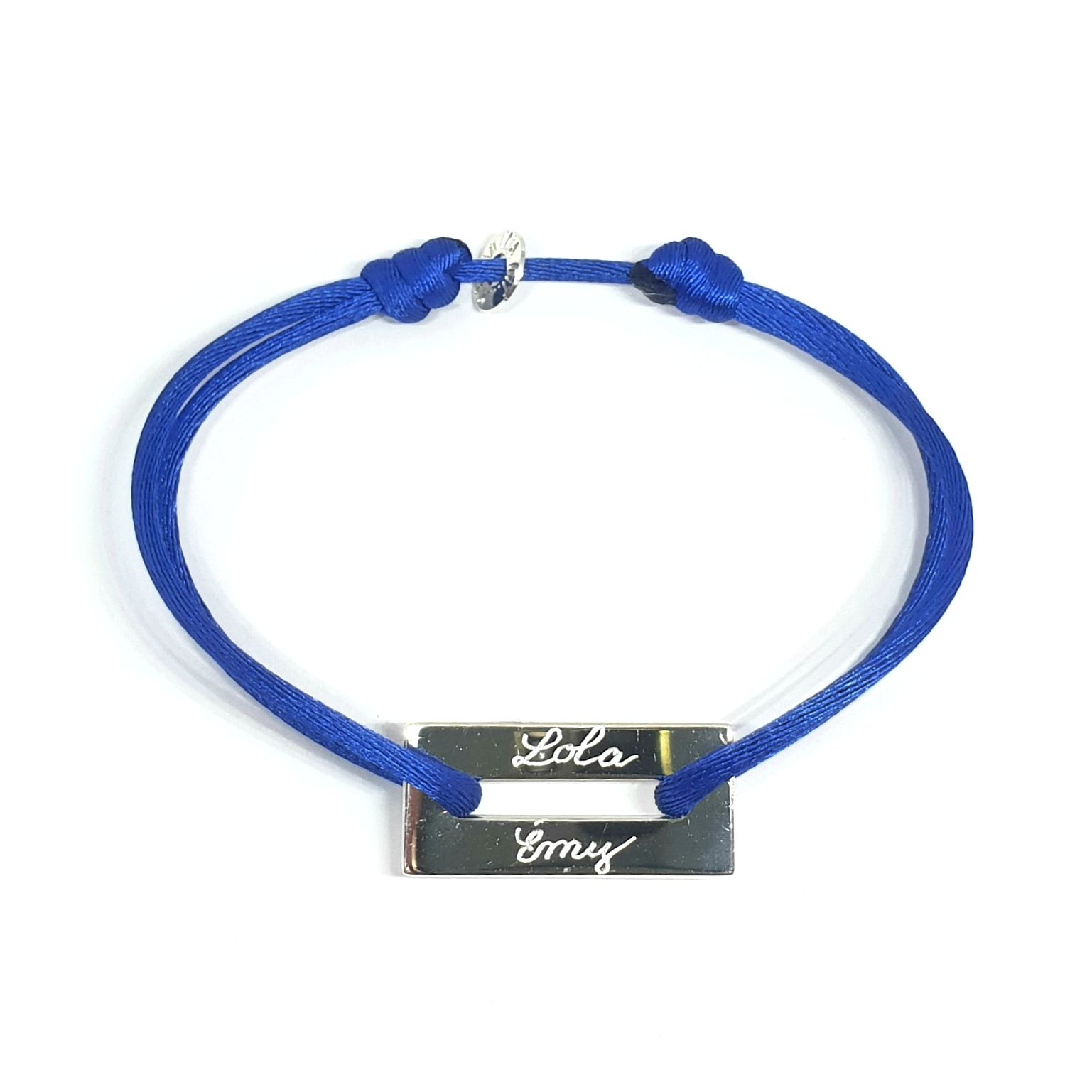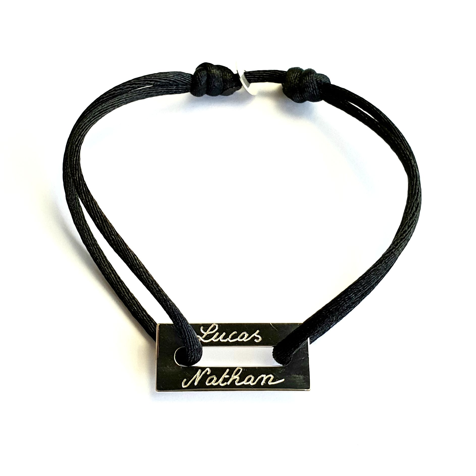 Bracelet plaque rectangulaire évidée 27 mm montée sur cordon. Je peux vous graver des prénoms au recto et une date au verso.