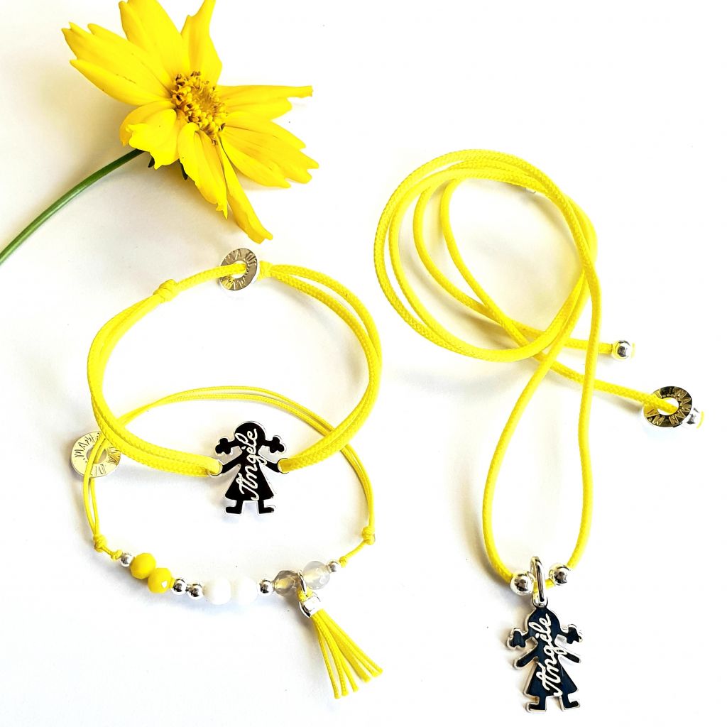 Bracelet perles couleurs coordonnées au pompon et au cordon Bracelet fille ou garcon 14x17 mm, collier personnage 15 mm Collier ajustable finition 3 perles
