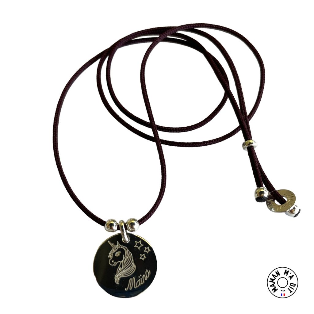 Collier médaille 20 mm en argent tête de Licorne 2 perles. Gravure noircie et finition polyester 3 perles dans la nuque en option