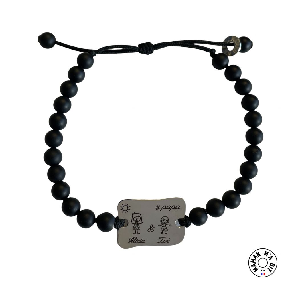 Bracelet valet rectangle 14 x 23 mm montage sur perles en agate noires mates Indiquez moi dans les commentaires la réf, l'ordre et les prénoms des personnages que vous souhaitez. Exemple : H3 Pierre F1 Louise D7 Marie
