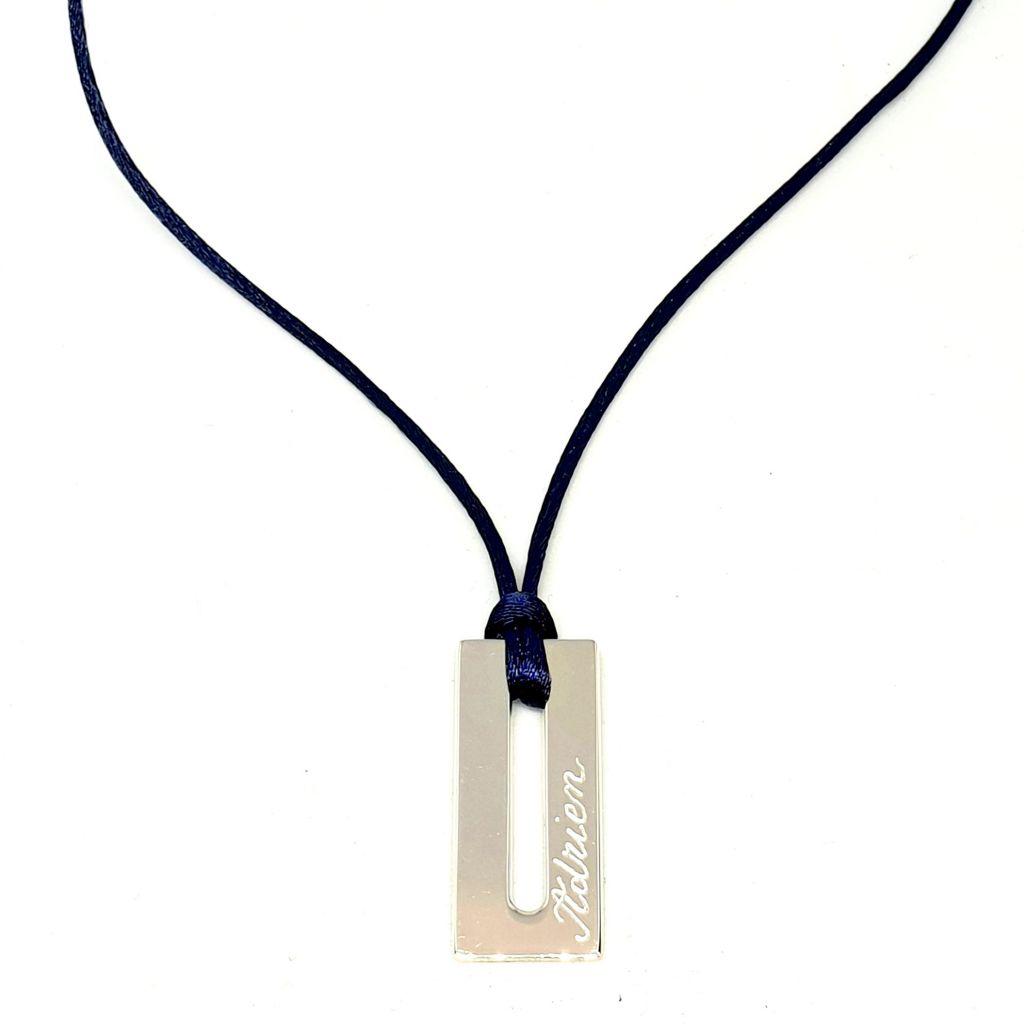Collier plaque rectangle 12 x 27 mm sur cordon queue de souris (le cordon queue de rat est trop épais pour la médaille). Possibilité de monter la plaque sur une chaîne (en option), longueur 55 maille forçat épaisse