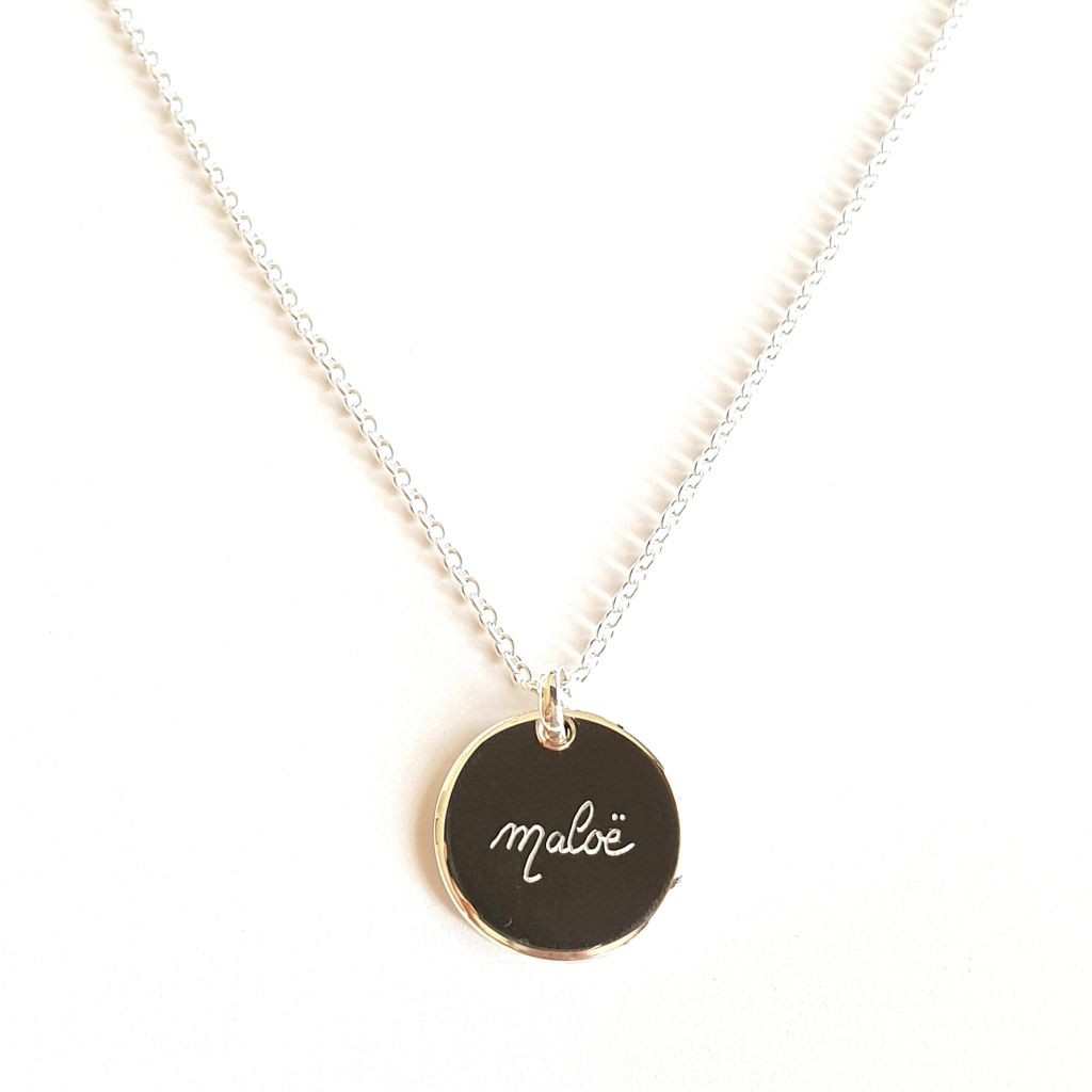 Collier médaille ronde 20  mm épaisse montée sur chaîne jaseron., longueur 40 cm puis maillon de rappel à 42 et extension à 45 cm. Je peux vous graver la médaille au recto ou au verso.