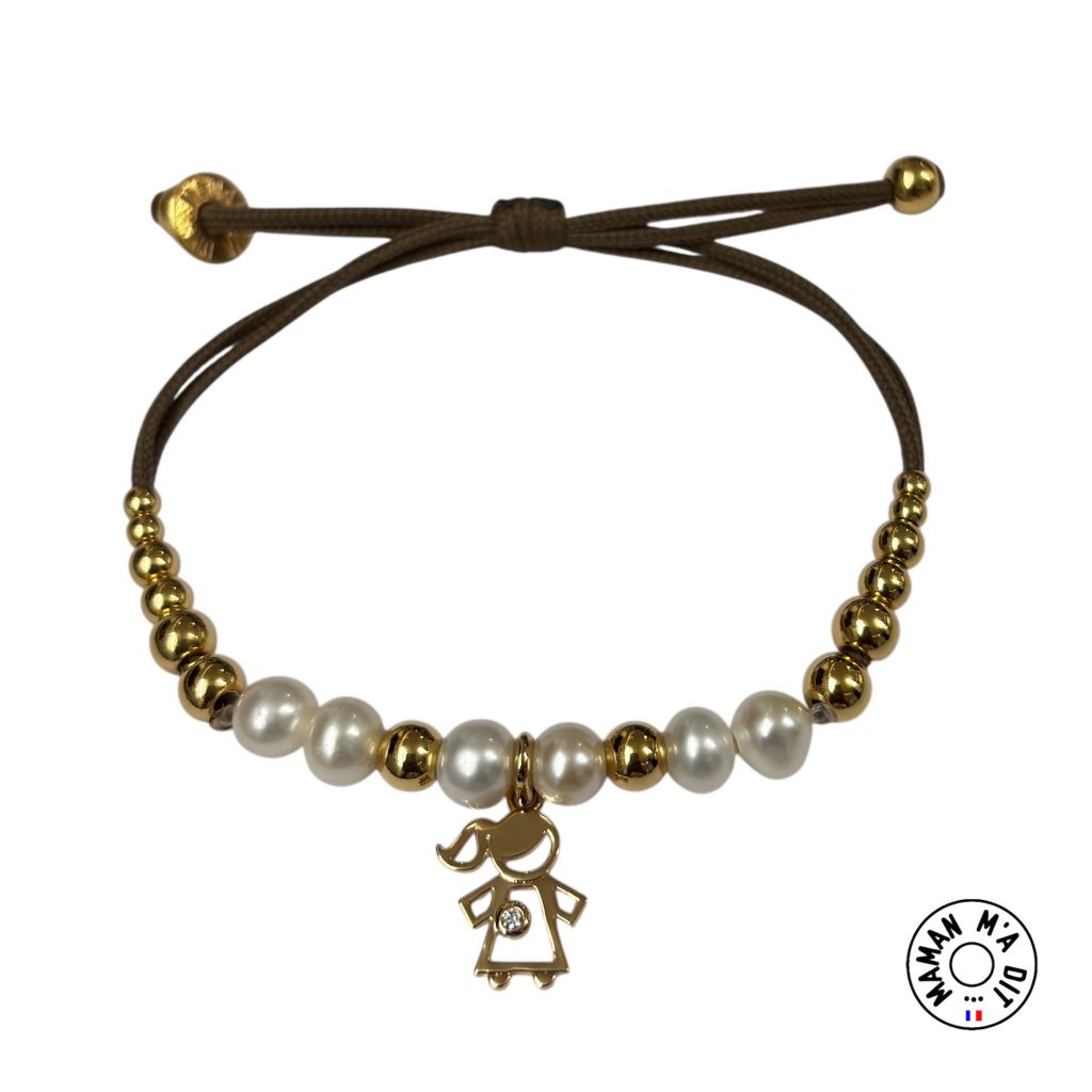 Bracelet perles de culture 6/7 mm et 1 personnage 1 strass fille ou garçon (à préciser svp). Possibilité d'ajouter des personnages. Montage sur cordon polyester 1 nœud coulissant et 2 perles.