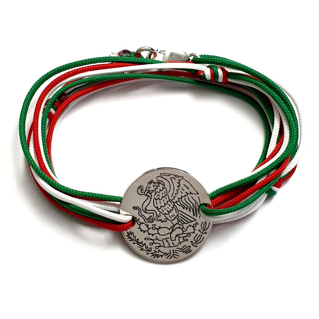 Bracelet jeton 24 mm drapeau du Mexique. Sur cette photo le cordon triple sur 3 tours, finition par mousqueton est en option (couleurs au choix)